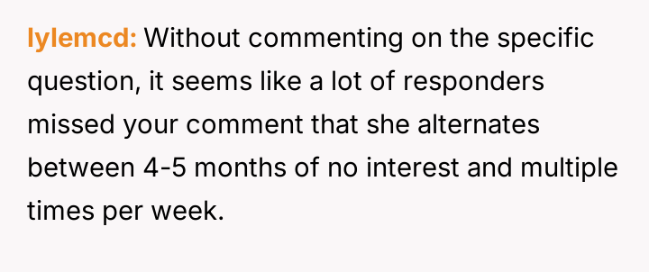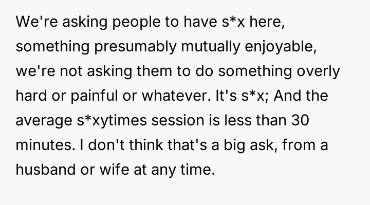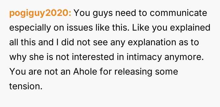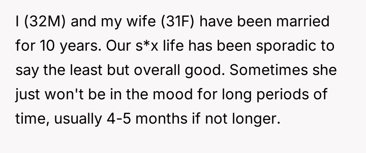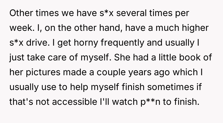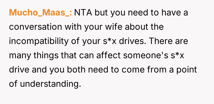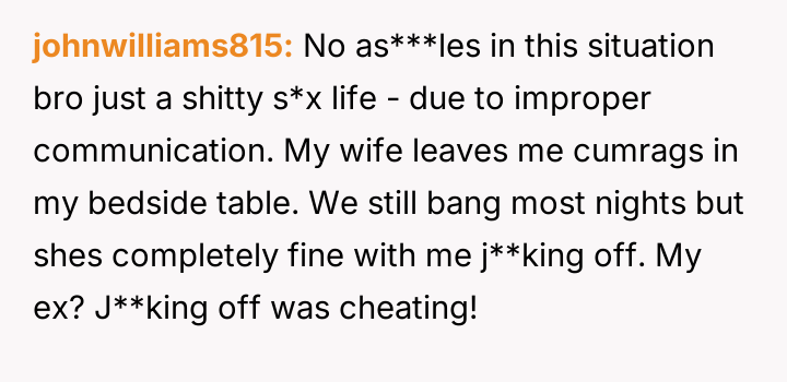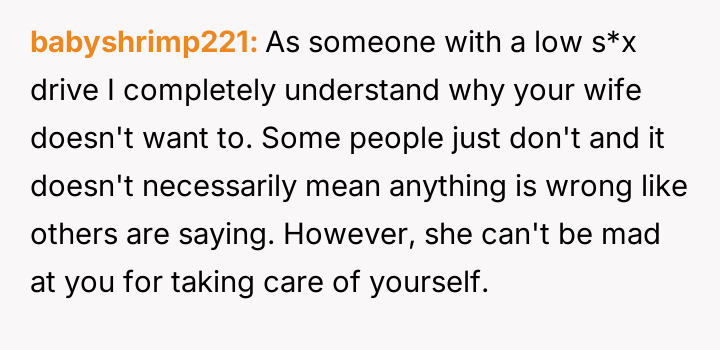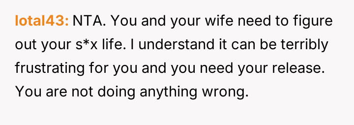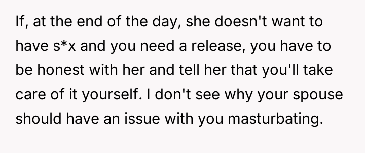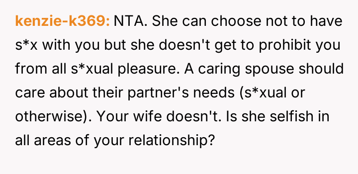 The original poster (OP) is facing a significant conflict rooted in mismatched libidos and differing expectations regarding sexual intimacy and self-gratification within their long-term marriage.