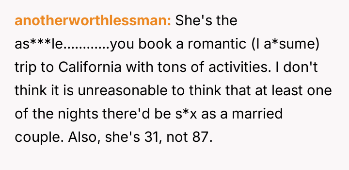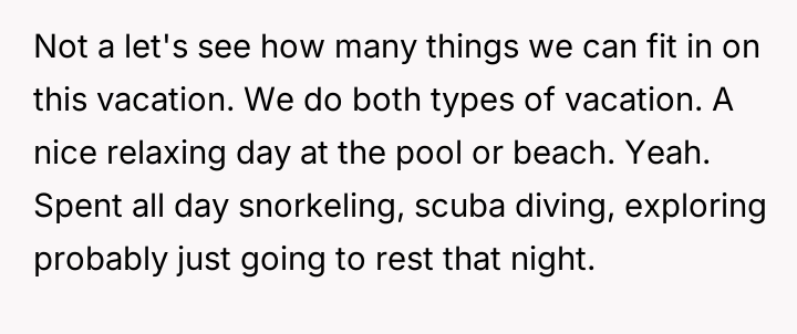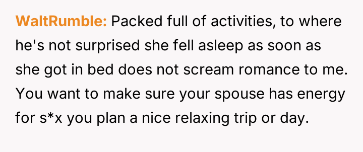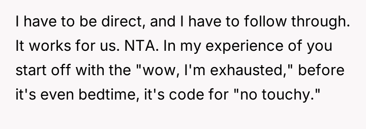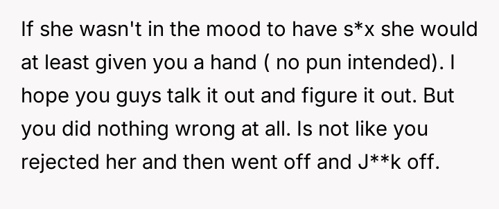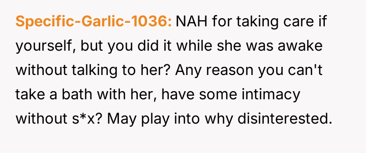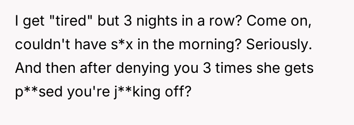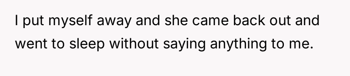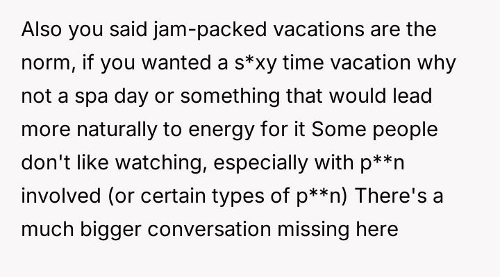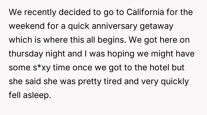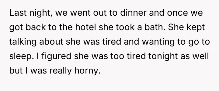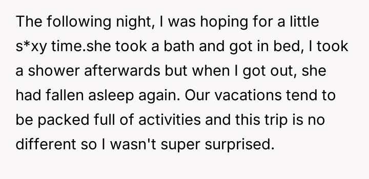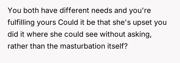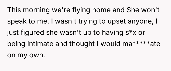 The central question for debate is whether the OP was justified in privately addressing their high sex drive through masturbation while on vacation, given the wife's expressed tiredness, or if walking in on the act constituted a breach of marital intimacy and respect, warranting the wife's current silence. Where does personal sexual need end and shared marital boundaries begin in this context?