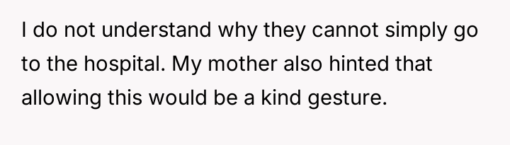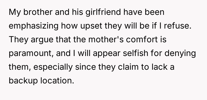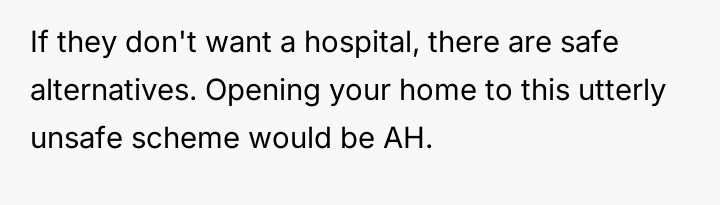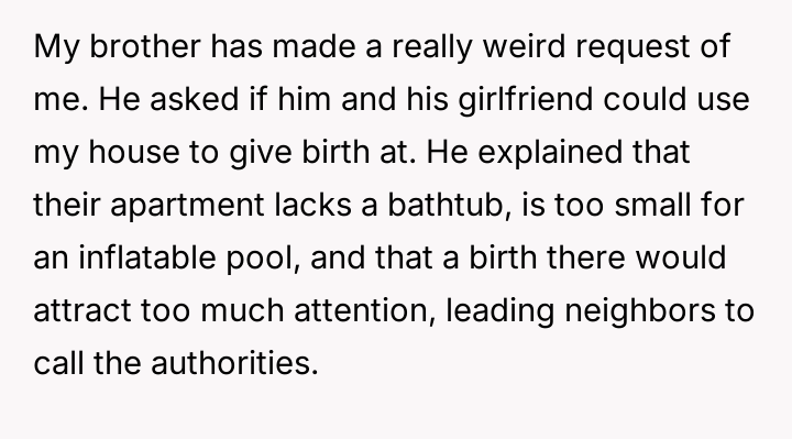 A brother's unusual plea to use his sibling's home as a sanctuary for childbirth, away from the sterile halls of a hospital, ignites a whirlwind of emotions—confusion, concern, and a desperate search for understanding in a situation far from ordinary.