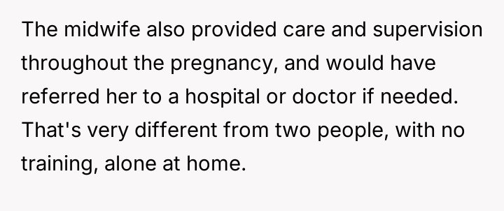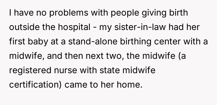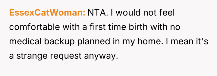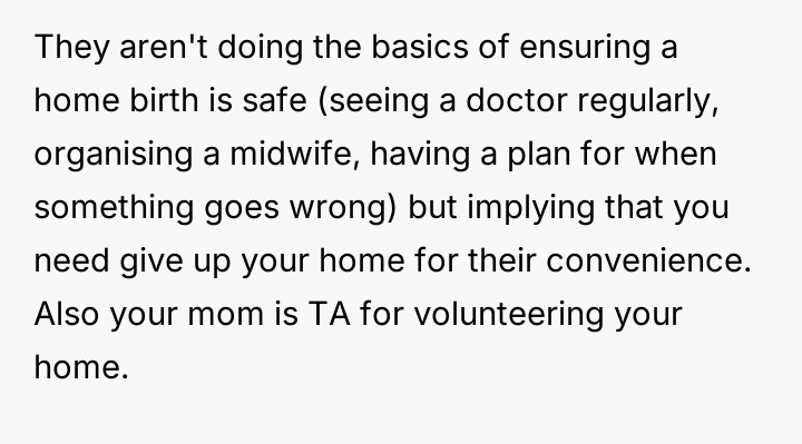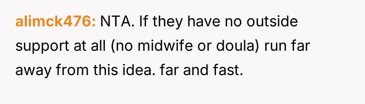 The original poster (OP) is caught between family obligation and personal comfort, as their brother pressures them to allow an unassisted, out-of-hospital birth in their private home.
