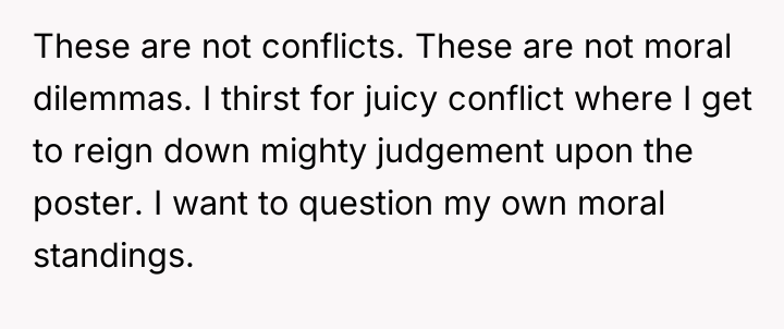 Is the desire for genuinely difficult moral quandaries a valid expectation for a public forum, or does the current trend of posting simple conflicts reflect a broader need for validation regarding basic social norms and personal boundaries?