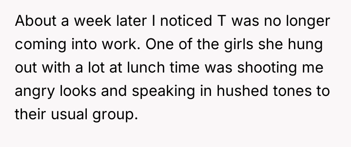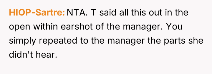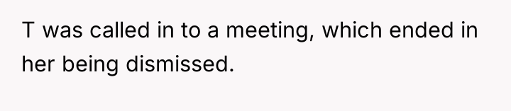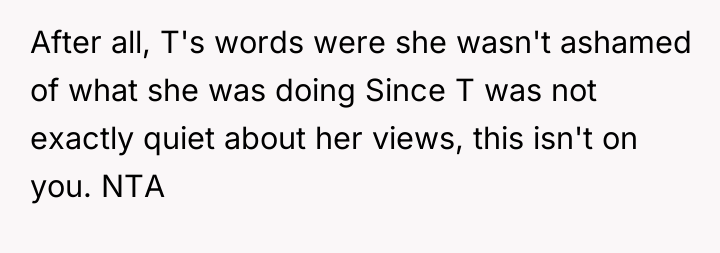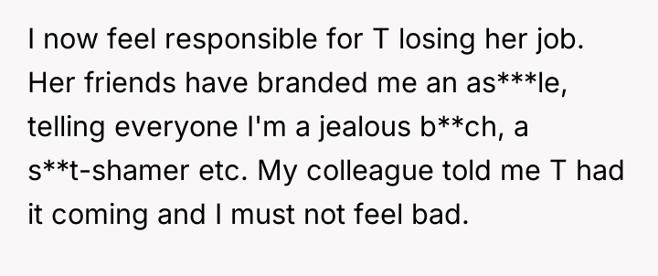 Did the OP bear responsibility for T losing her job by reporting the initial conversation, or was T's termination solely the result of her own professional conduct and the company's policies?