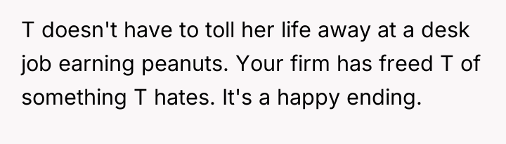 The original poster (OP) is experiencing significant distress and guilt after their co-worker, T, was terminated from their financial advisory firm.