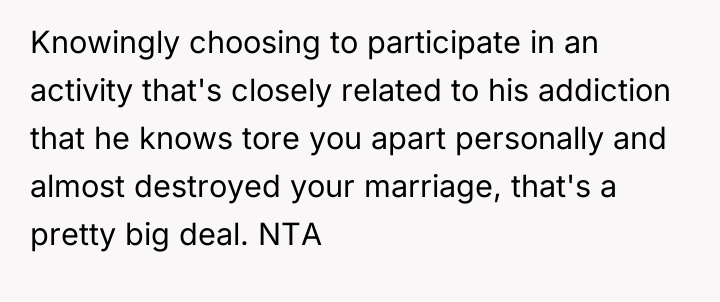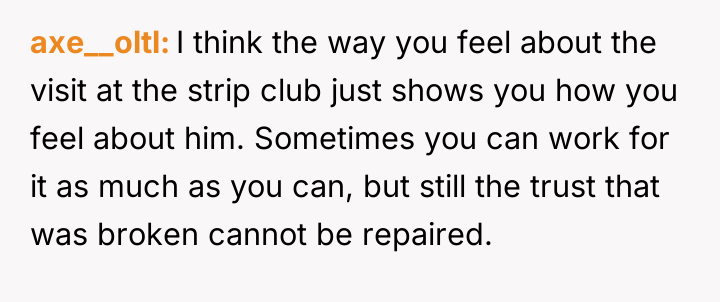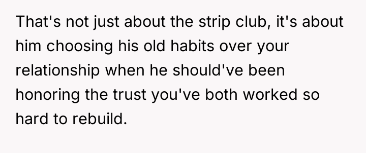 Is the poster overreacting to a brief visit to a strip club, or is this action a clear and unacceptable violation of the trust necessary for recovery, confirming that her feelings of disrespect are entirely valid?