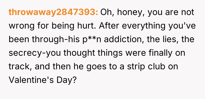 The original poster is experiencing profound hurt, anger, and numbness following her husband's visit to a strip club shortly after promising to overcome his severe pornography addiction.
