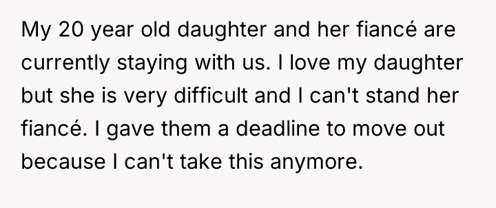 The original poster (OP) is facing significant stress due to the presence of their daughter and fiancé, leading them to enforce a move-out deadline.