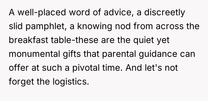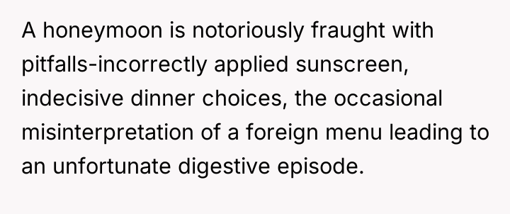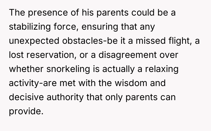But that fragile dream shattered when news came that his parents would be vacationing at the exact same place and time, their presence looming over the intimate retreat she had envisioned.