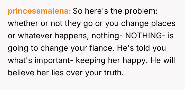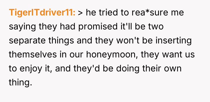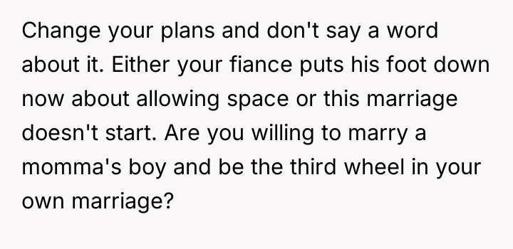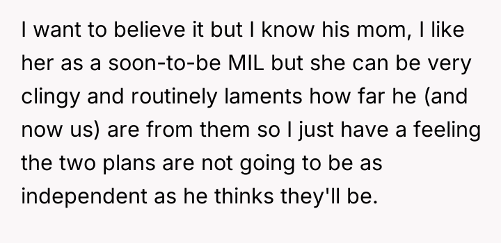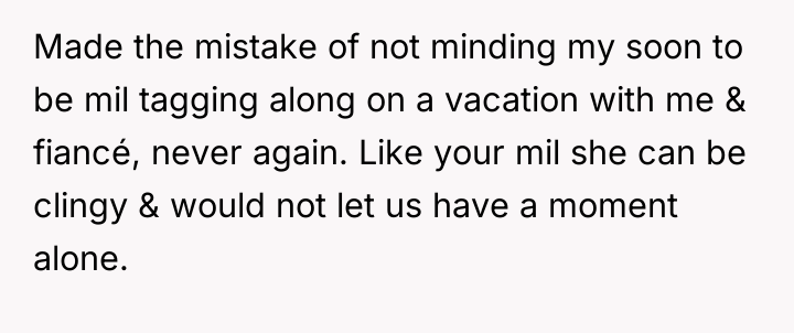 Given the commitment made by the in-laws to keep a distance, should the OP trust her fiancé's assurances that the vacations will remain separate, or is her fear, based on past experience with her future mother-in-law's clinginess, justified in demanding a more definitive action, such as changing the destination entirely?