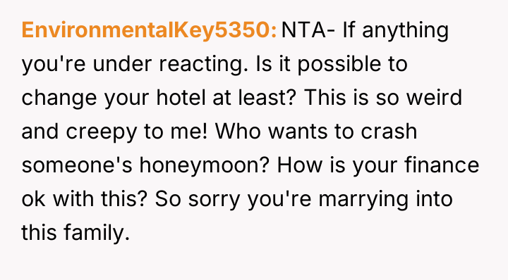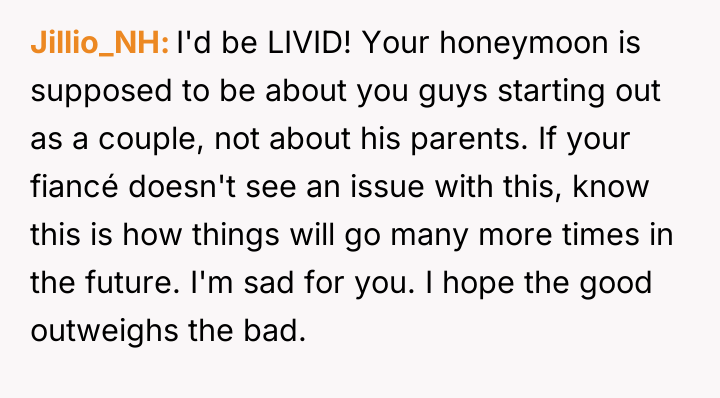 The original poster (OP) is experiencing significant distress because their carefully planned, private honeymoon has been unintentionally compromised by the presence of the fiancé's parents at the same destination and hotel.