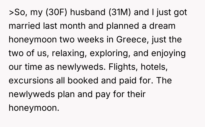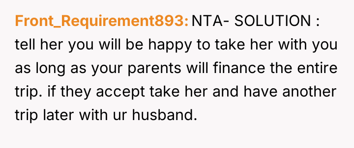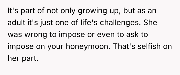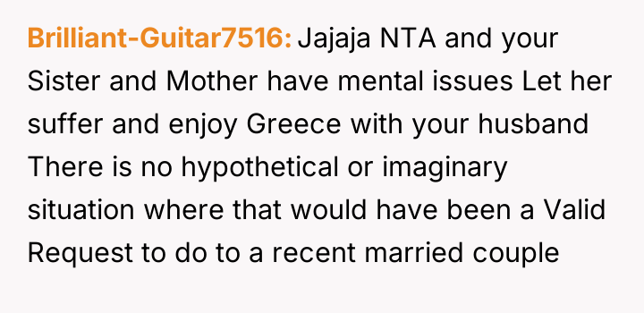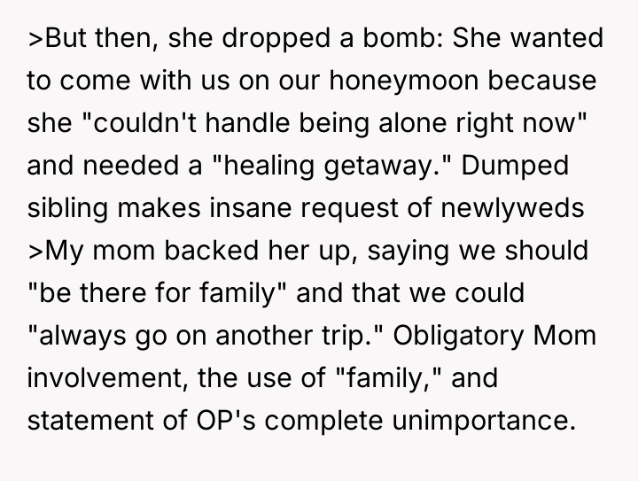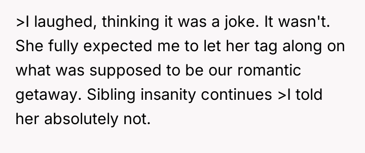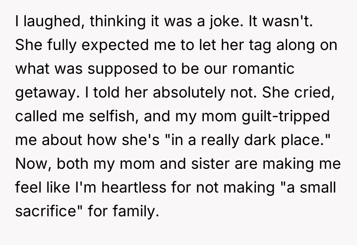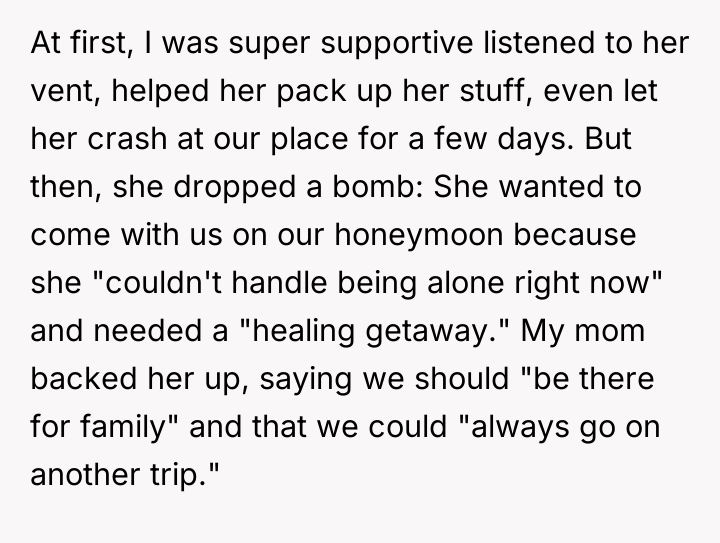 Given the clear financial and emotional investment in the trip meant for the couple, was the OP justified in firmly refusing to allow her sister to join the honeymoon, or did her obligations as a supportive family member outweigh the need to maintain boundaries for her own marriage?