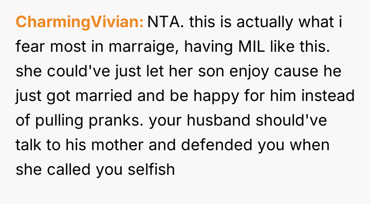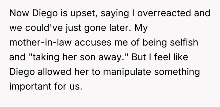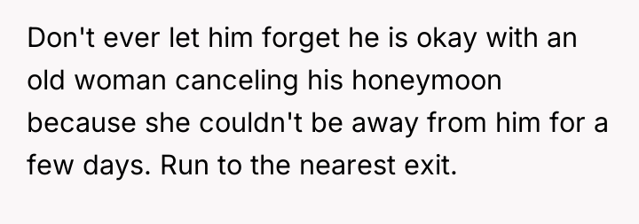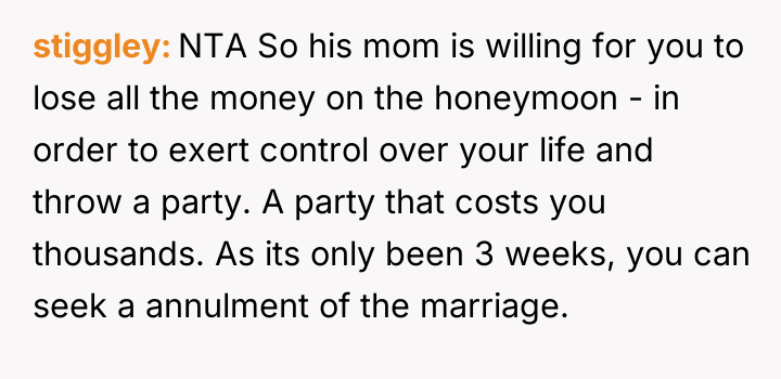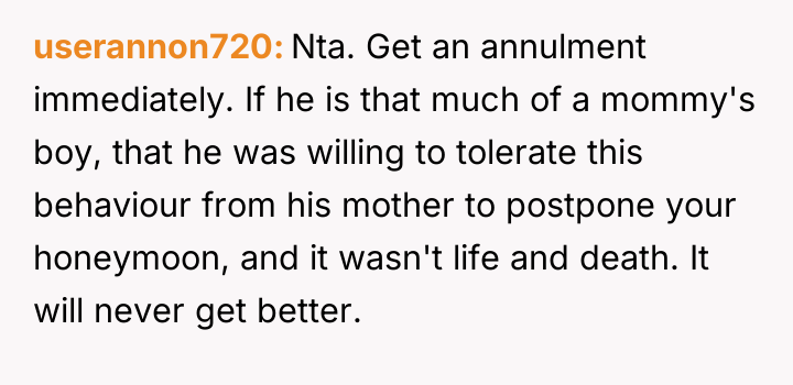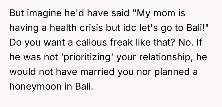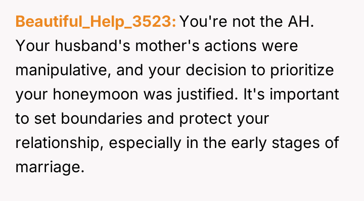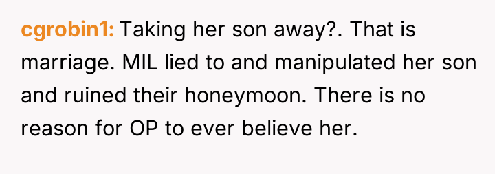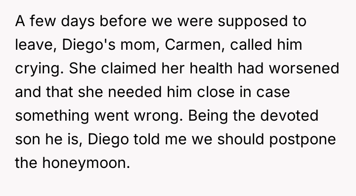 The original poster (OP) felt deeply betrayed and disrespected when her new mother-in-law manipulated a health crisis to prevent the honeymoon, an event the couple had prioritized.