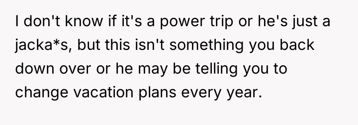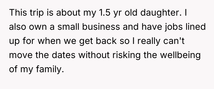 The OP feels justified in protecting their family's planned trip, especially given the personal and professional commitments involved, leading to significant frustration over the perceived expectation of yielding their plans.