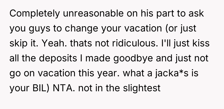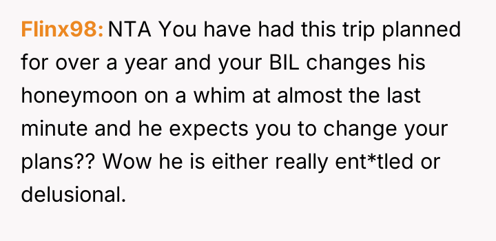Given that the OP and his wife made concrete plans for their family vacation long before the BIL changed his honeymoon location, is the OP justified in refusing to alter or cancel their trip to accommodate the BIL's sudden change of plans, or should family harmony take precedence over pre-scheduled personal commitments?