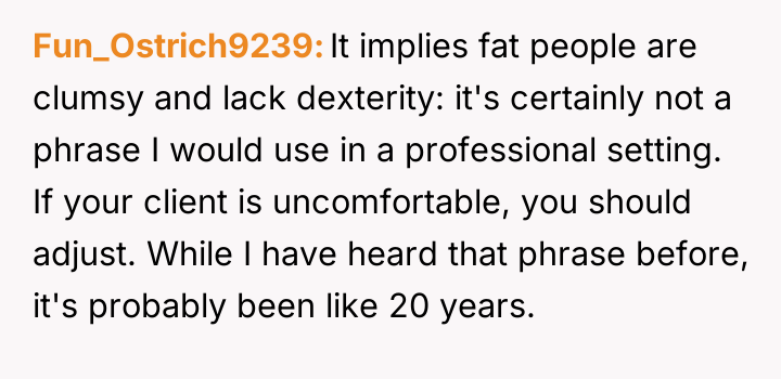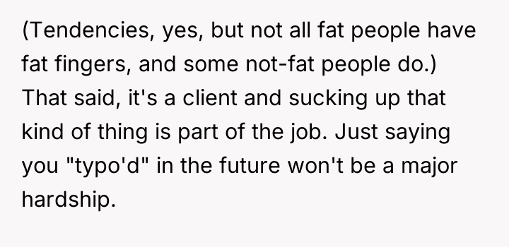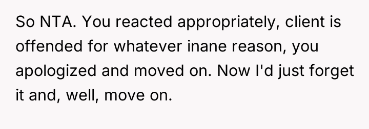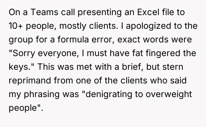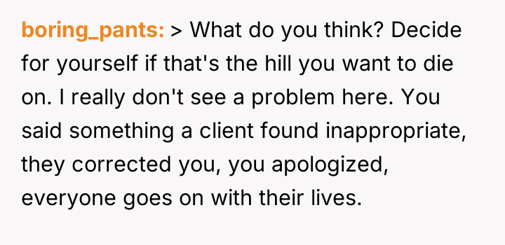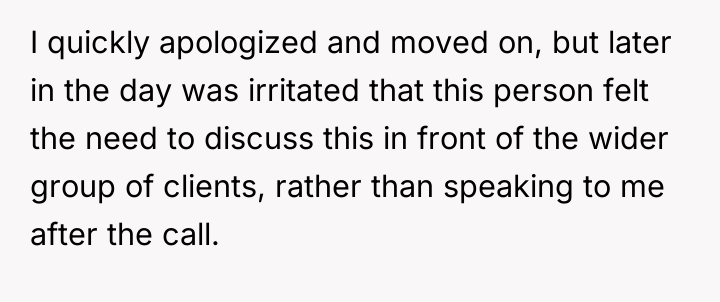 The Original Poster (OP) experienced a moment of minor error during a professional presentation, which led to an unexpected public critique from a client regarding their self-deprecating language.