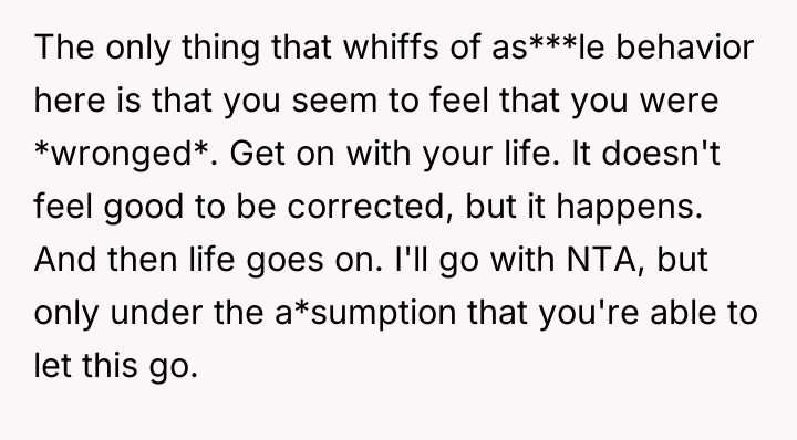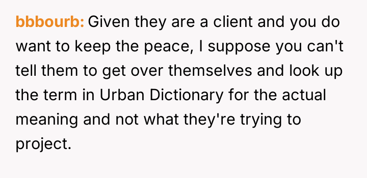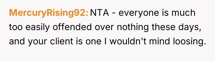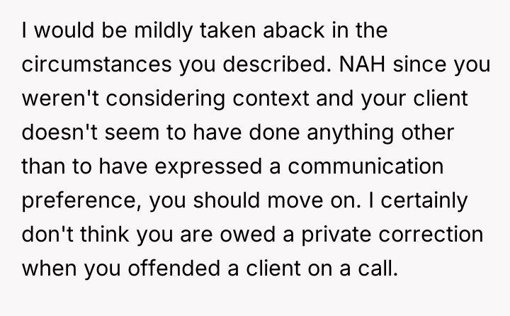 The OP's core conflict lies in feeling unfairly disciplined in a public setting for a casual comment, causing irritation that the client prioritized this correction over professional courtesy by addressing it immediately in front of others.