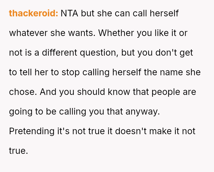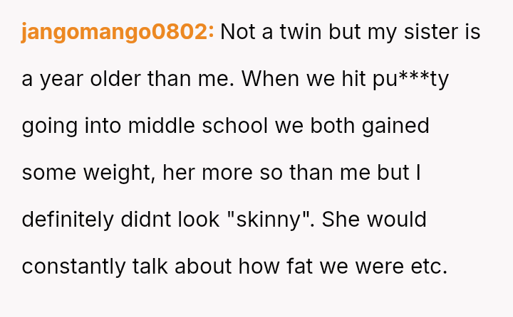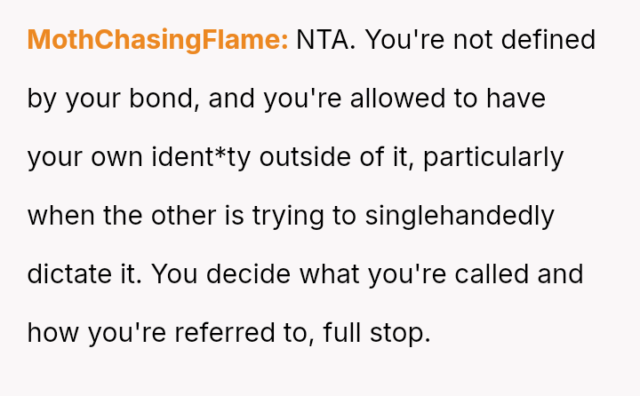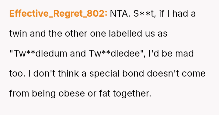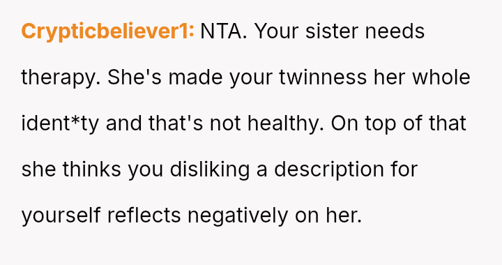 Given the sister's reaction, the core question is whether the OP was justified in setting a boundary against a label she found hurtful, even if it was intended by the twin as affectionate or descriptive, or if her action unfairly damaged the sister's perception of their relationship and shared ident*ty?