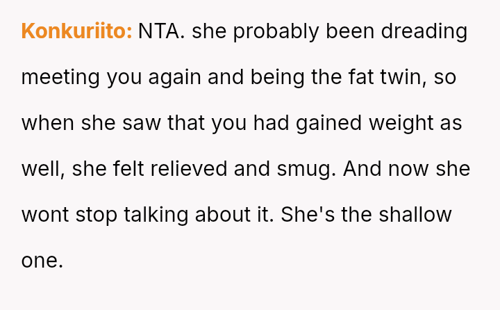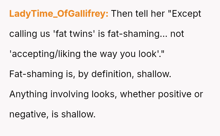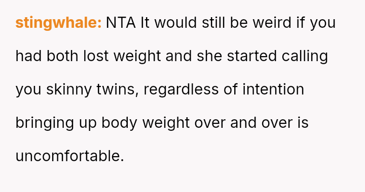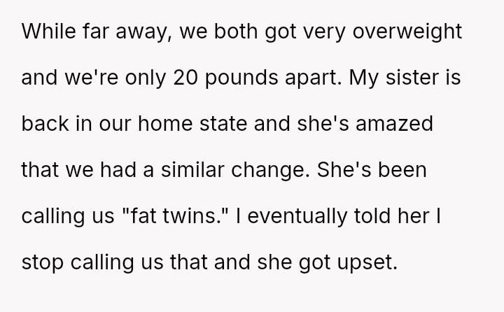The sister interpreted the refusal to use the term "fat twins" as a personal rejection of her appearance and an insult to their unique bond.