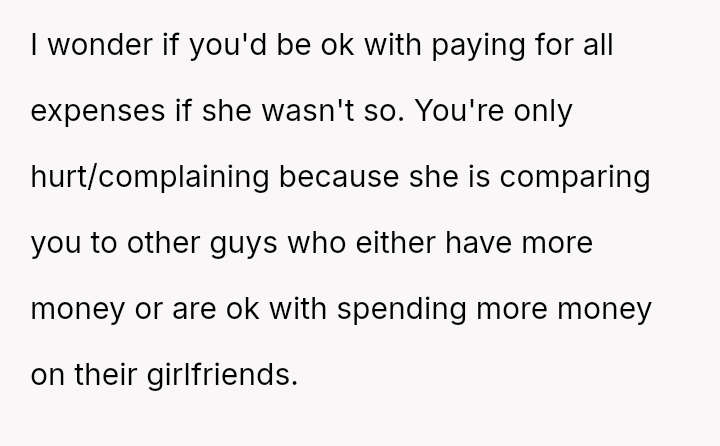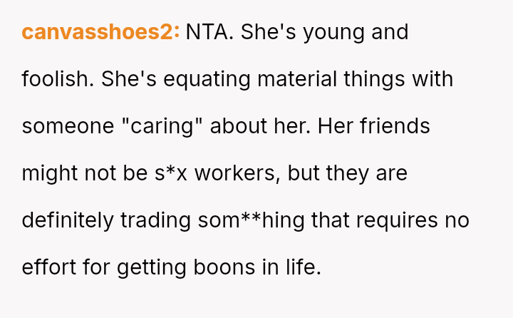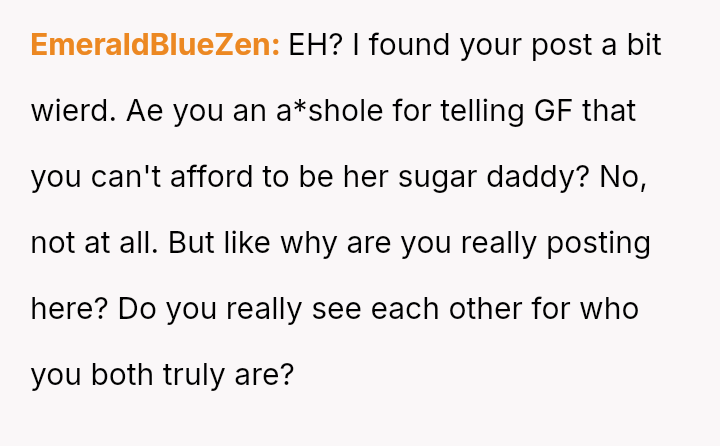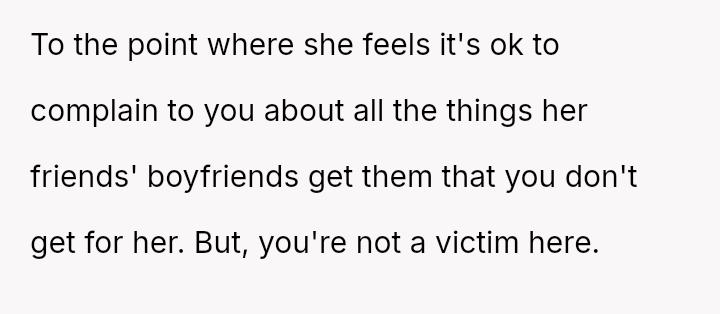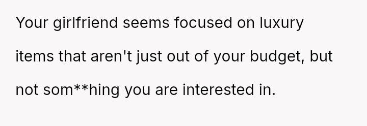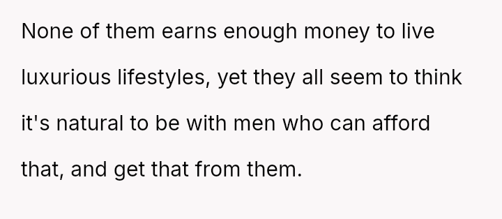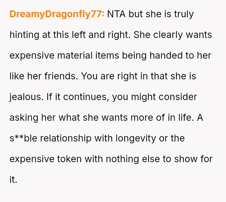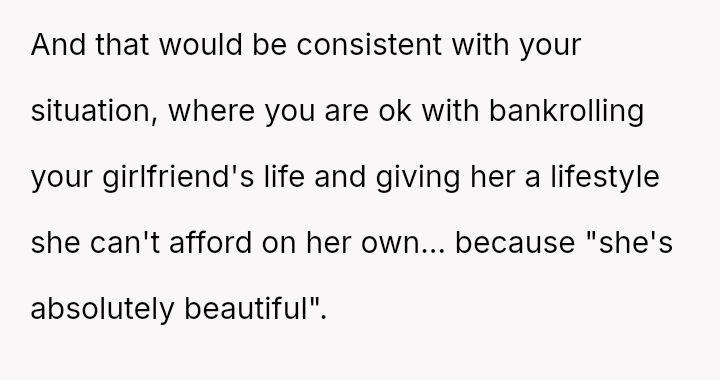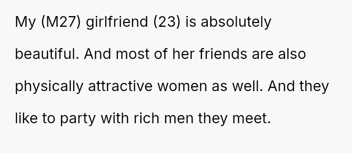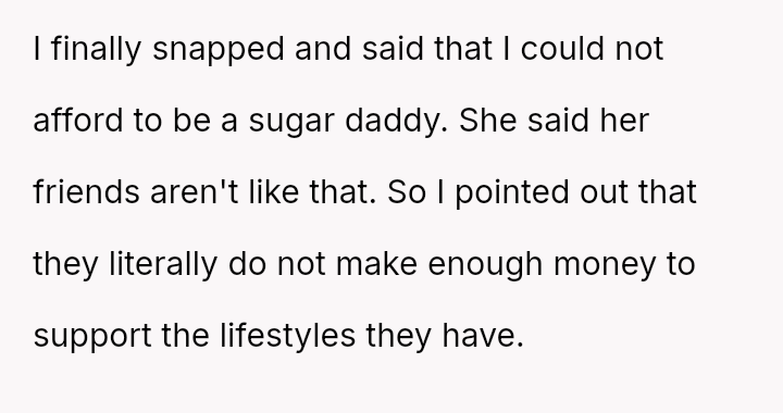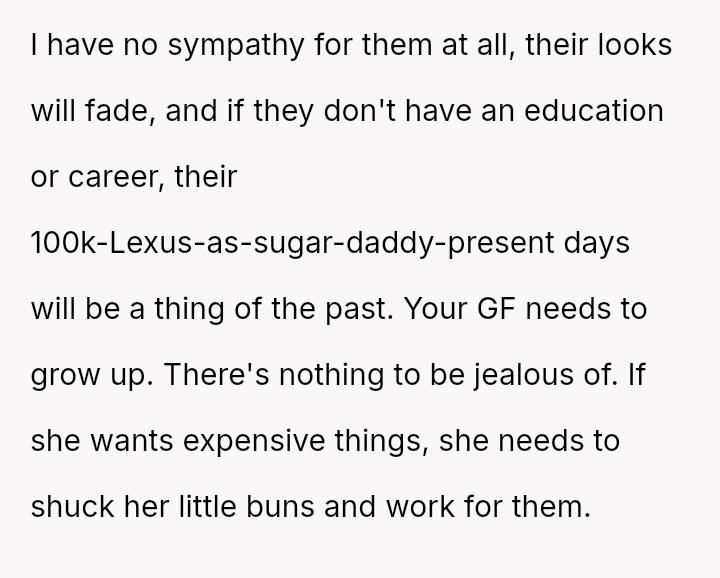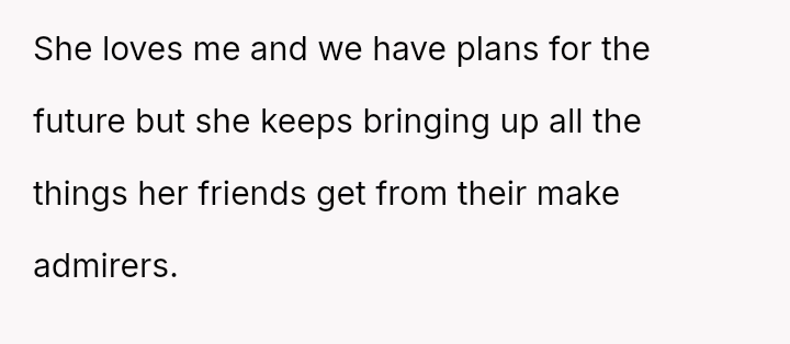 The core issue revolves around the girlfriend's apparent desire for a lifestyle that mirrors that of her friends, funded by external admirers, which the OP refuses to emulate.