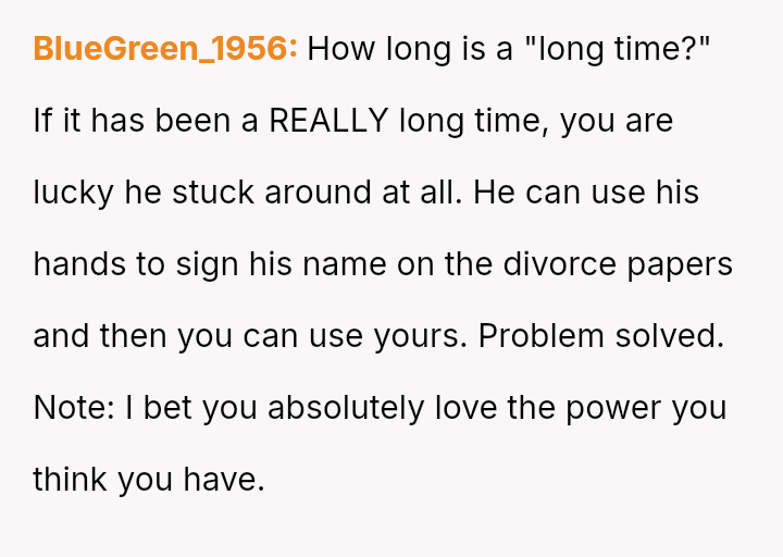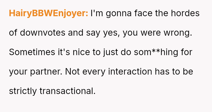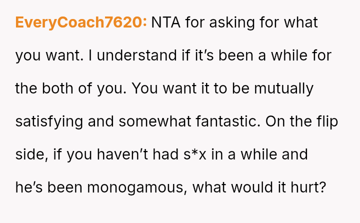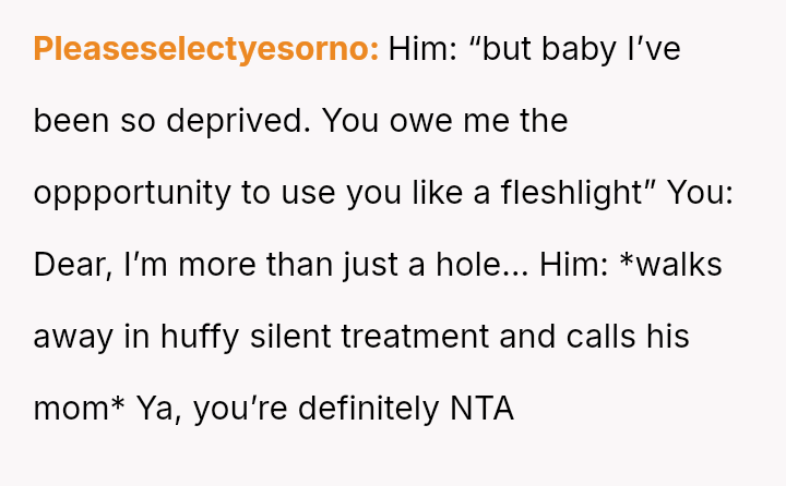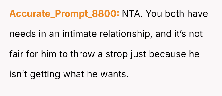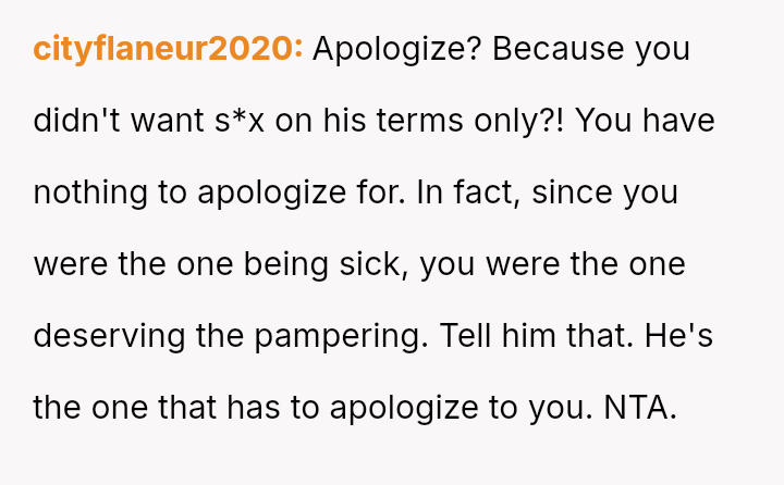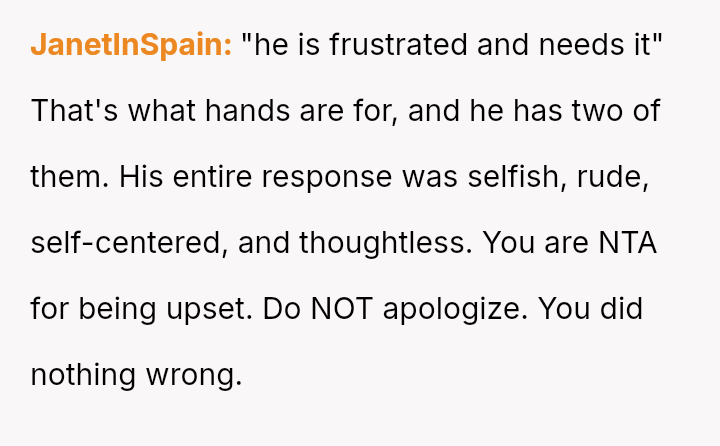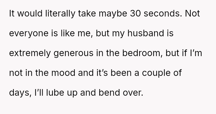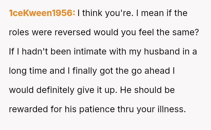 Given the OP's insistence on mutual enjoyment versus the husband's prioritization of a quick release, the core question remains: Is it reasonable to require equal participation and satisfaction in s*xual intimacy when one partner has been deprived of it due to illness, or should the other partner's immediate frustration and need for relief take precedence in such a brief window?