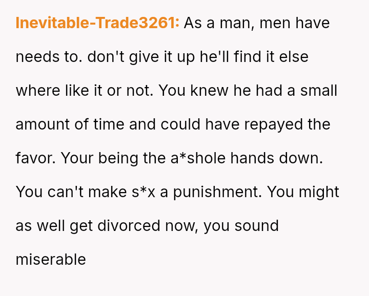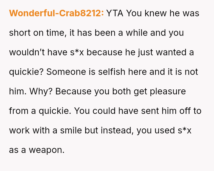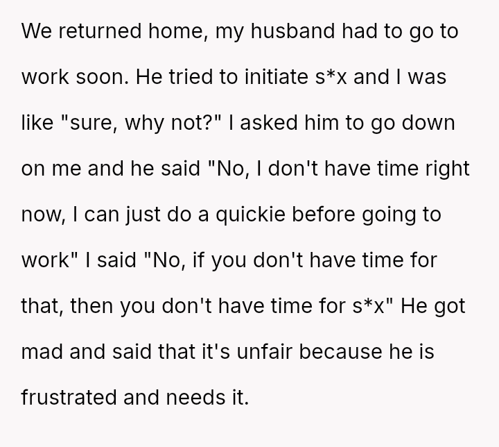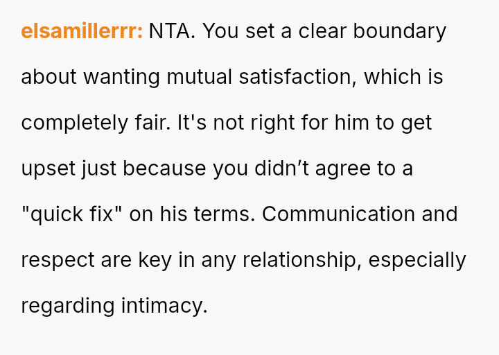 The original poster (OP) expressed a clear boundary regarding s*xual intimacy, insisting that if her husband could not allocate time for mutual satisfaction, the encounter should not happen at all.