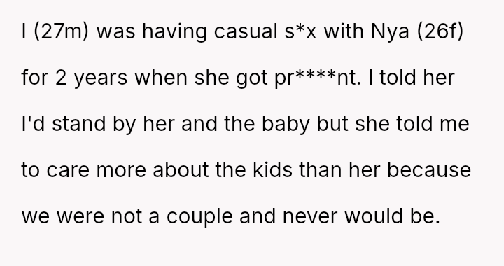 The individual, a 27-year-old male, was casually involved with a 26-year-old female for two years, which resulted in a pregnancy.