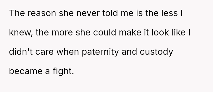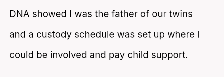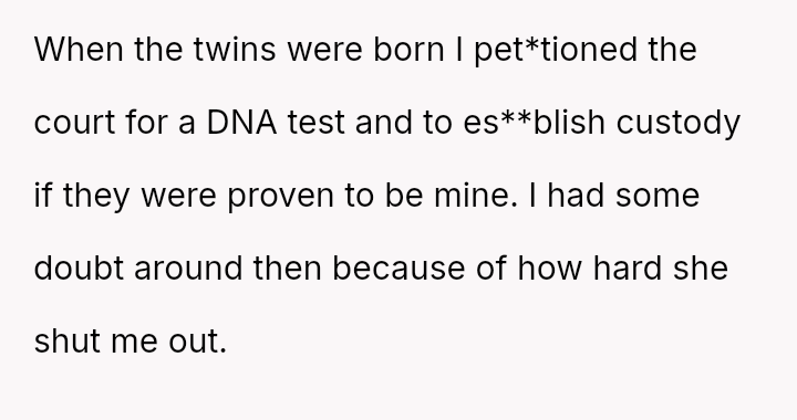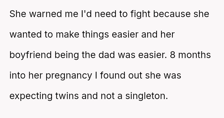 This escalated when the OP discovered she was pr****nt with twins and had hidden this fact, seemingly to strengthen her legal position against him, leading him to pet*tion the court for DNA testing and custody after the birth.