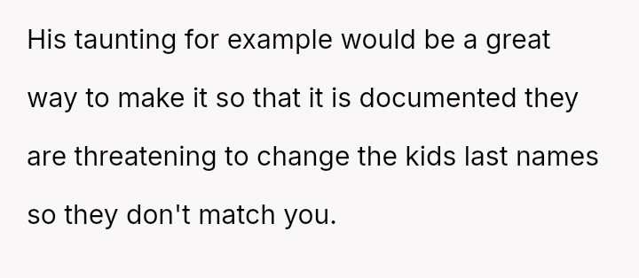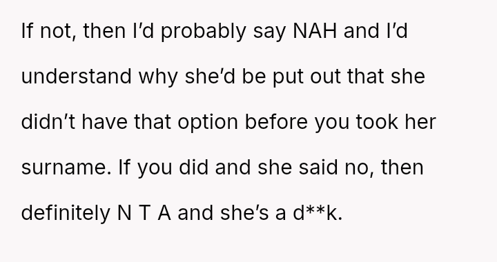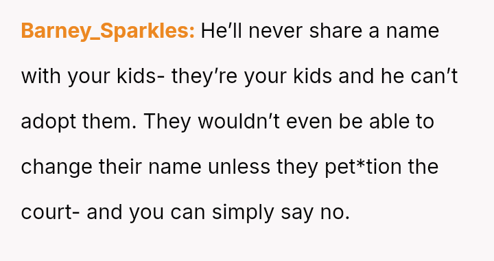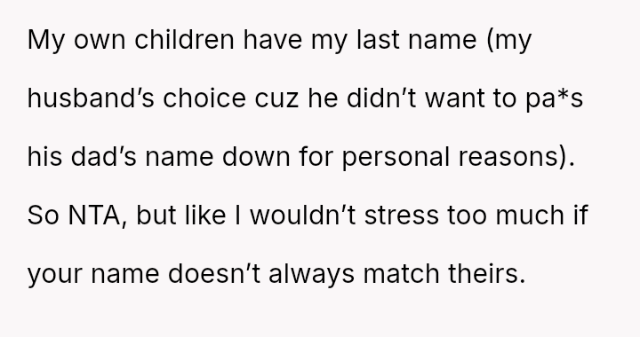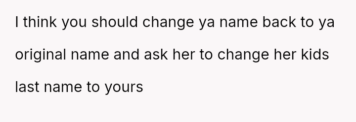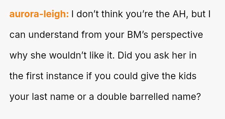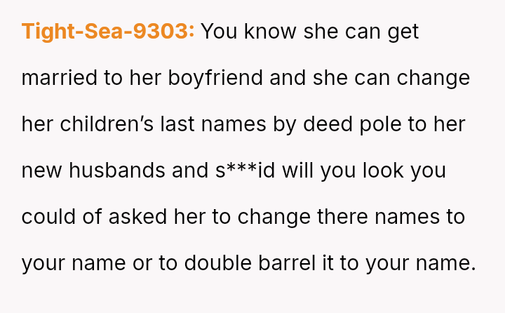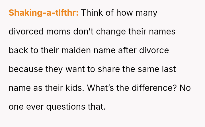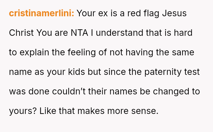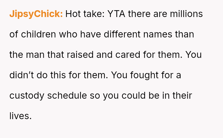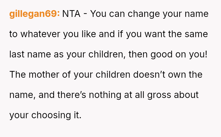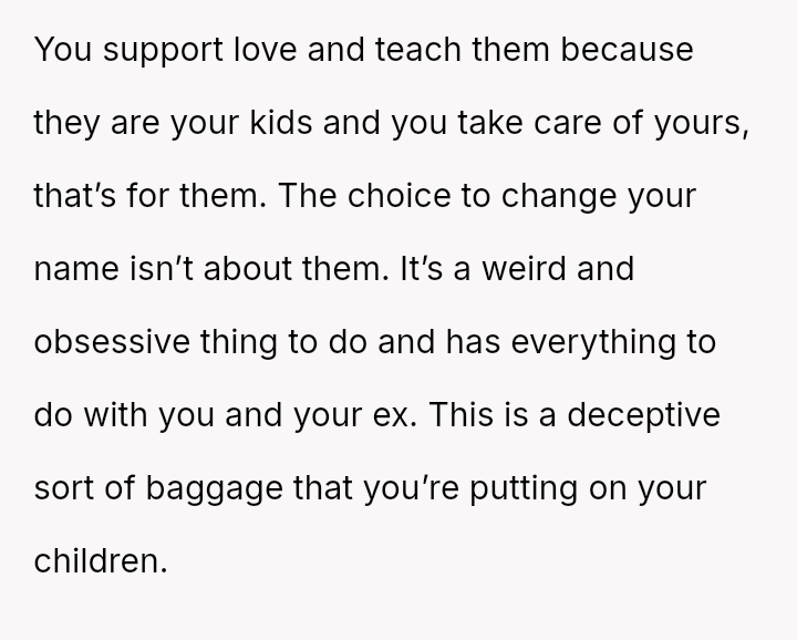 The question for debate is whether changing his surname to match his children’s, done for personal connection and not for his ex, const*tutes an inappropriate or antagonistic action in the context of co-parenting.