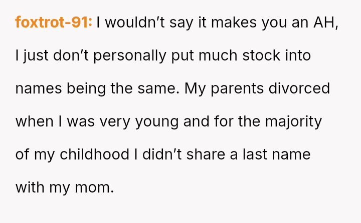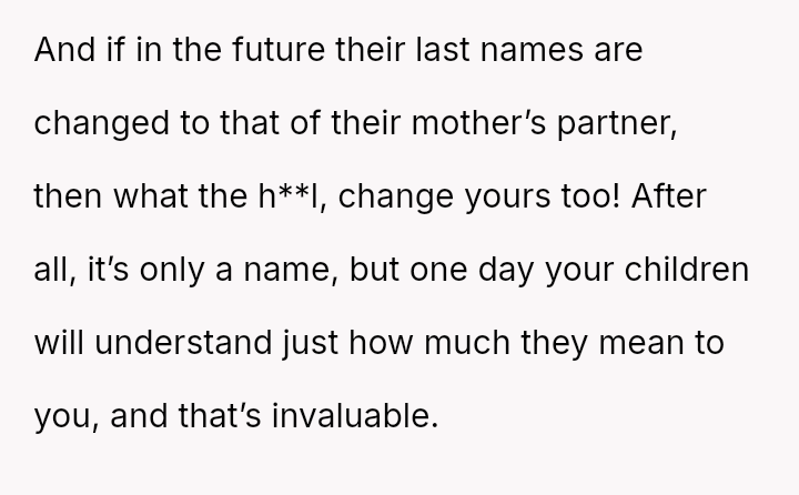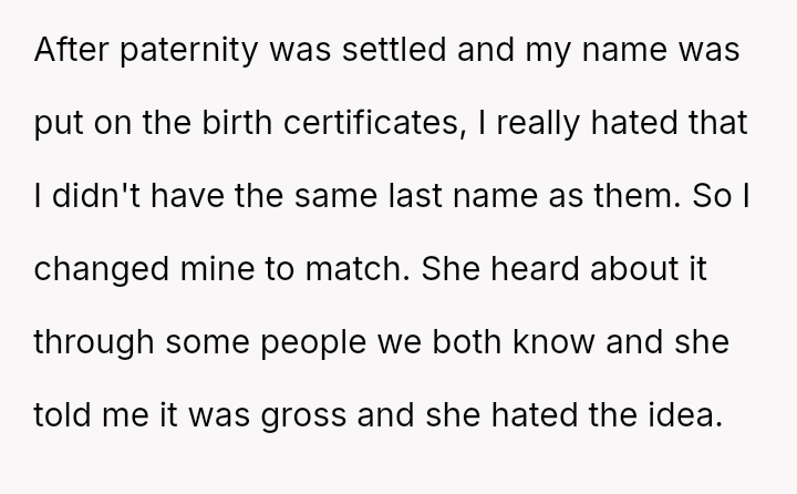 The Original Poster is reflecting on a significant personal decision—changing his last name to match that of his twin children following a difficult custody es**blishment process.