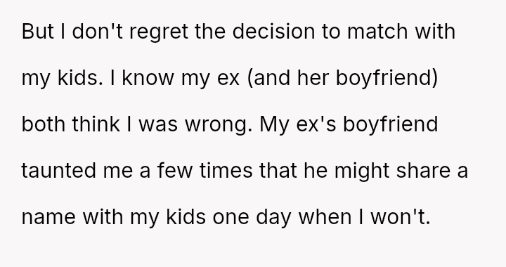 While he feels affirmed and connected to his children by sharing a name, especially on his first Father's Day, he acknowledges that his ex-partner and her boyfriend strongly disapprove and believe his action was motivated by spite or compet*tion.