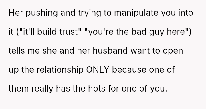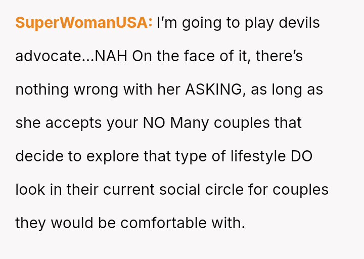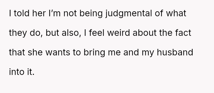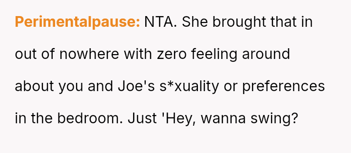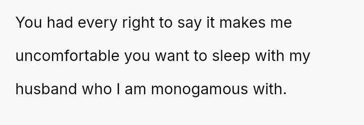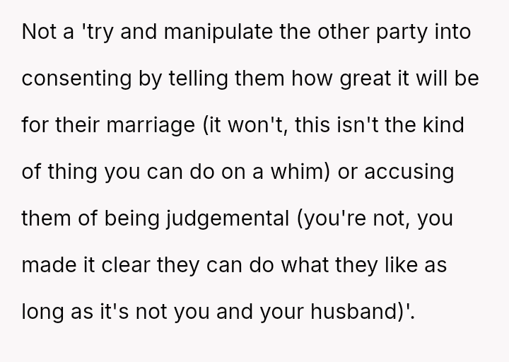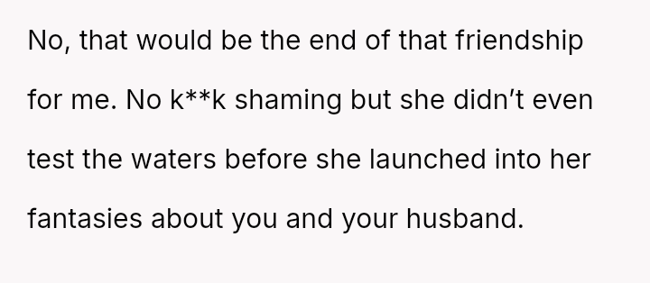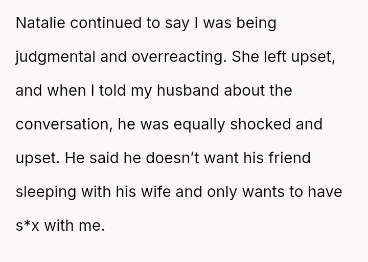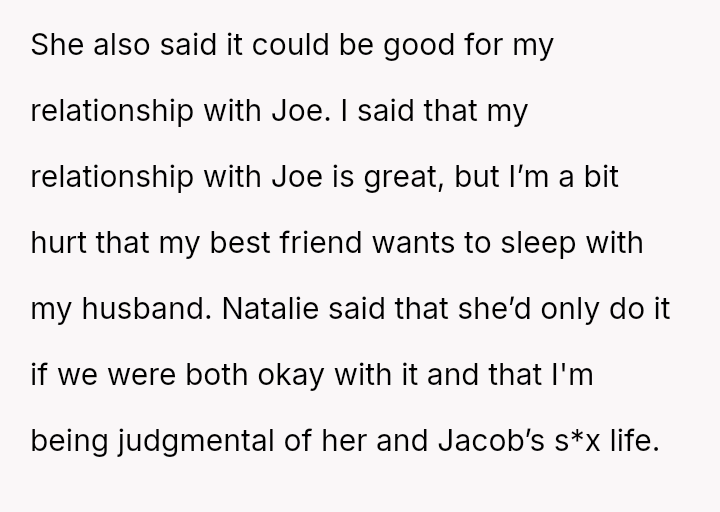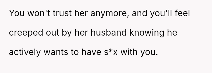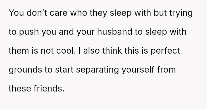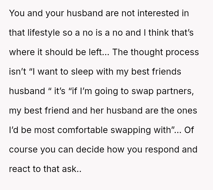 Given the strong negative emotional reaction from both the OP and her husband, is the OP justified in feeling deeply hurt by her best friend's proposition, or is she being overly judgmental of her friends' evolving s*xual interests and potentially damaging a significant friendship over a boundary dispute?