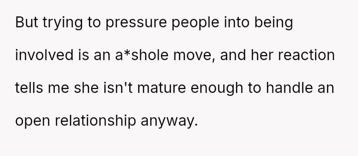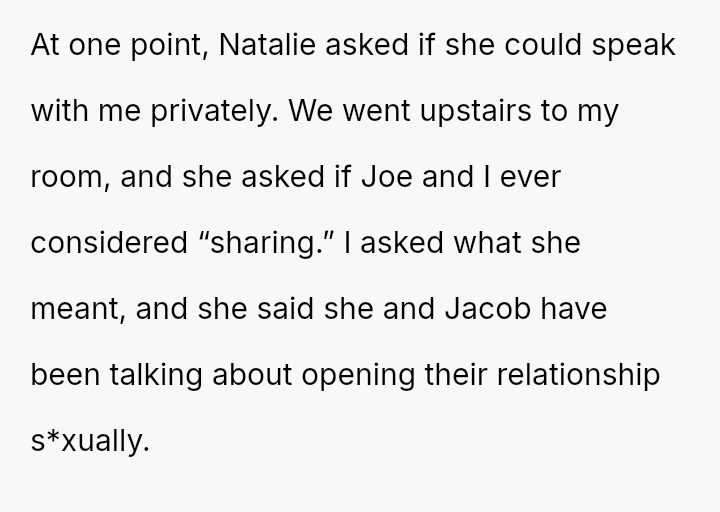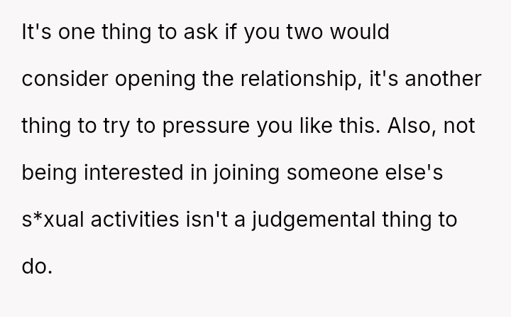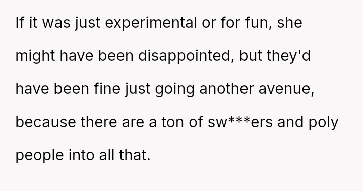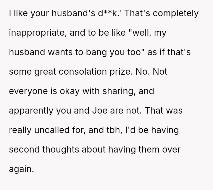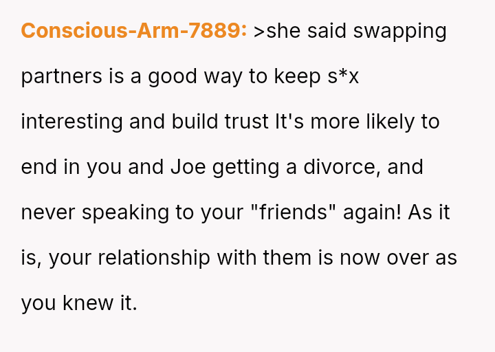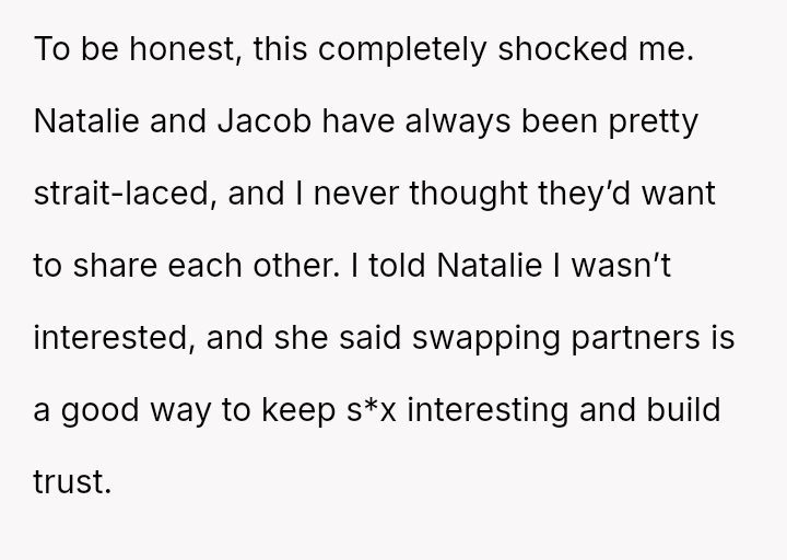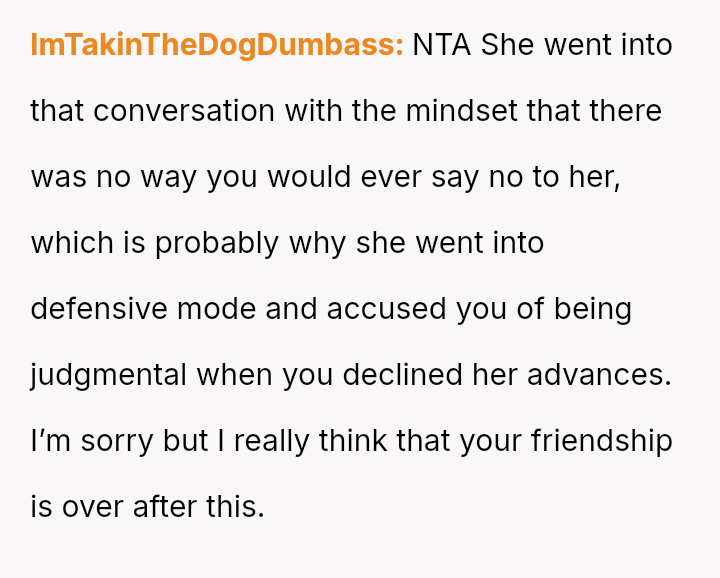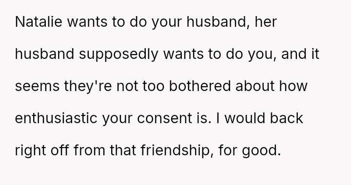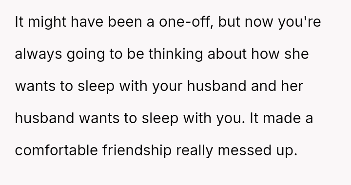 Given the strong negative emotional reaction from both the OP and her husband, is the OP justified in feeling deeply hurt by her best friend's proposition, or is she being overly judgmental of her friends' evolving s*xual interests and potentially damaging a significant friendship over a boundary dispute?