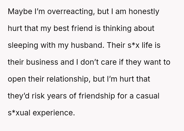 The original poster (OP) is experiencing deep hurt and shock after her best friend proposed a s*xual arrangement involving the OP's husband.