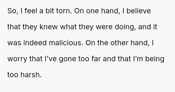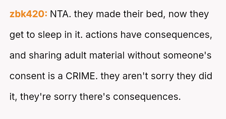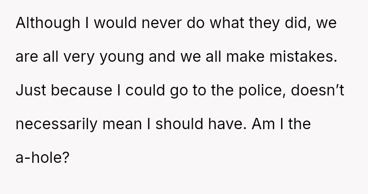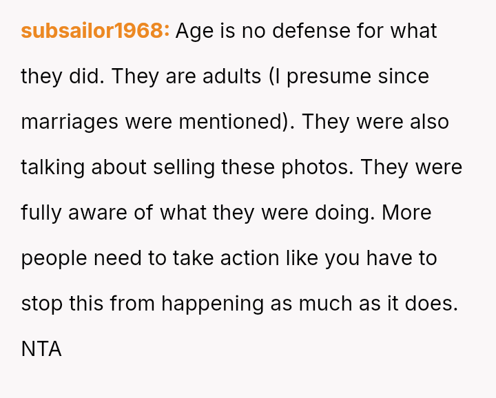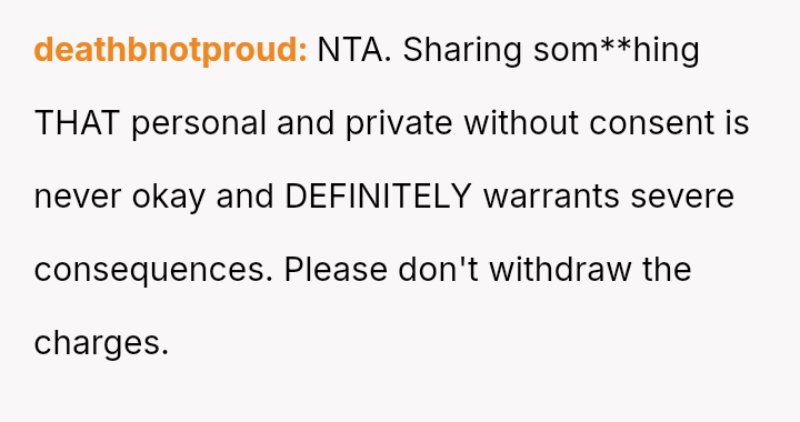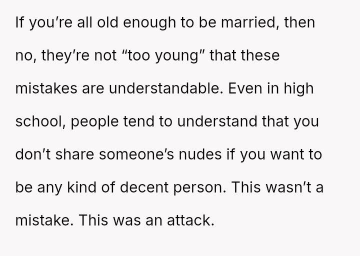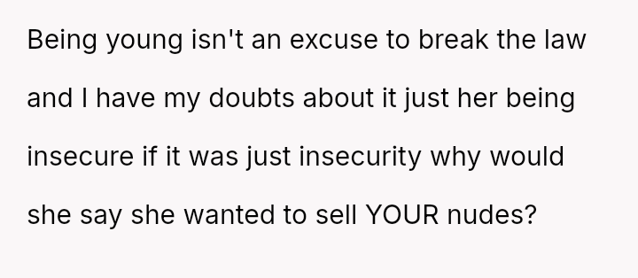 The original poster (OP) is experiencing significant conflict between their deep feeling that the sharing of their private images was malicious and wrong, and a countervailing worry that pursuing legal action might be an overly severe response given the youth of the involved parties.