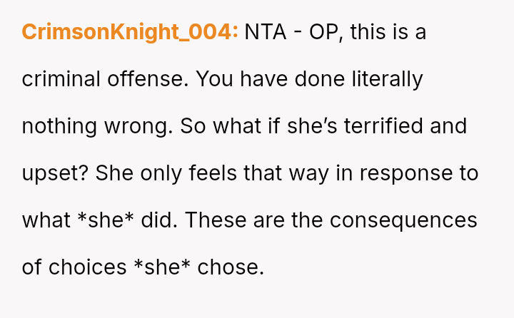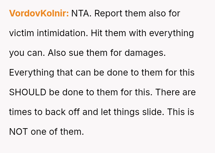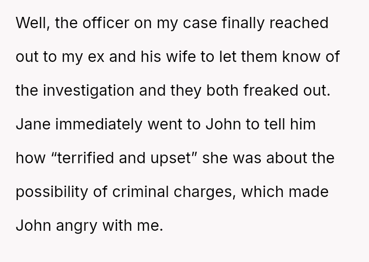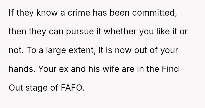 The central conflict lies between the OP's right to safety and privacy versus the ex-partner and his new wife's desire to avoid criminal consequences for their actions.