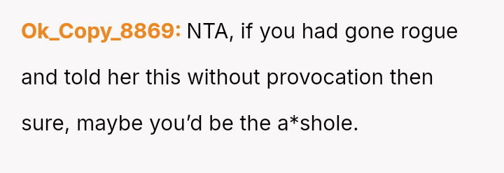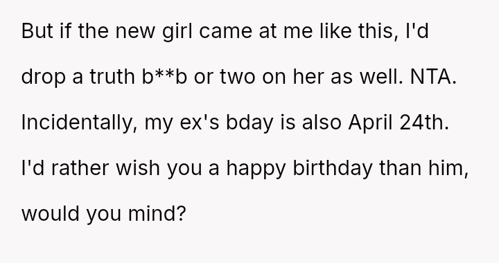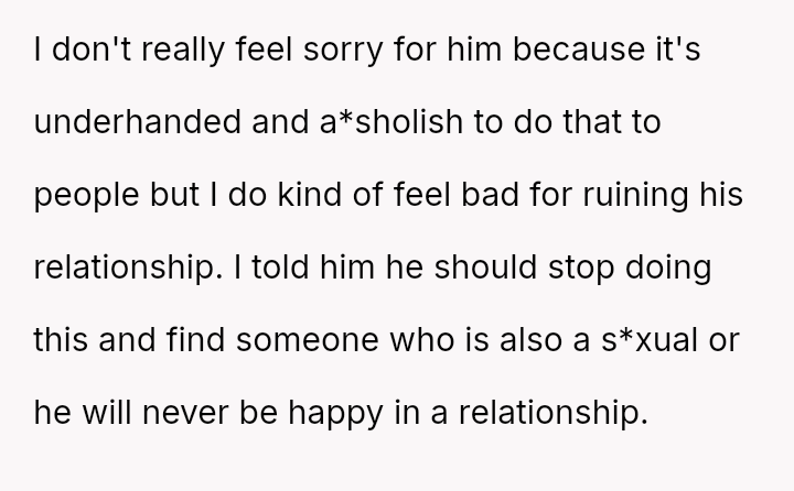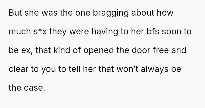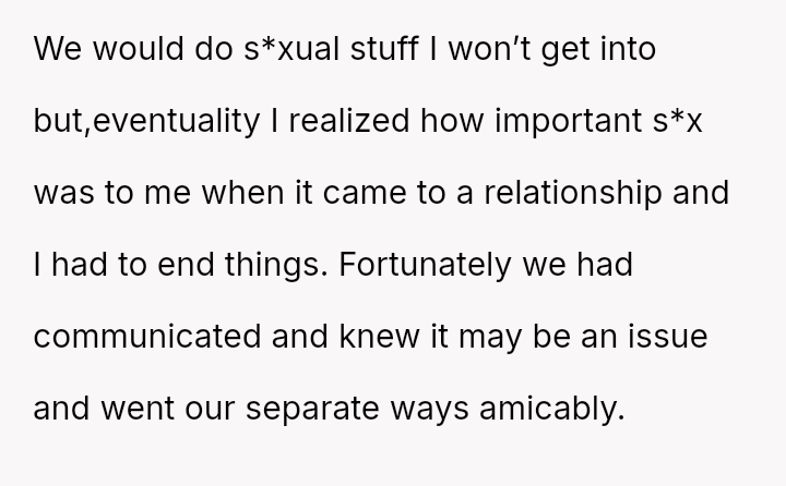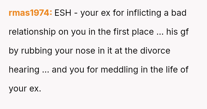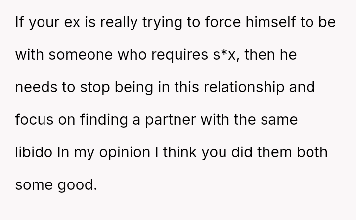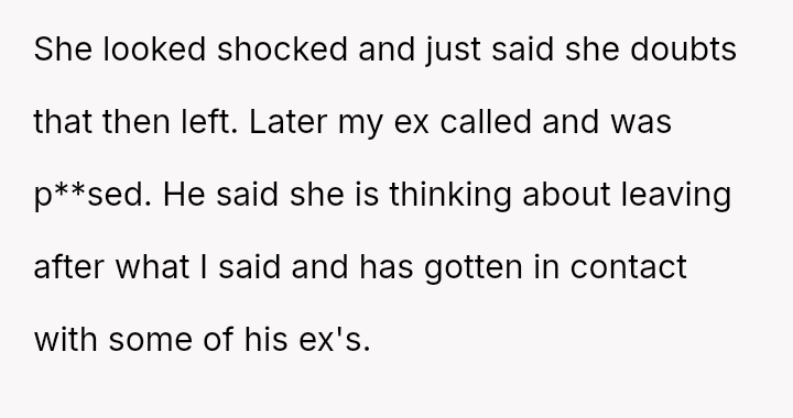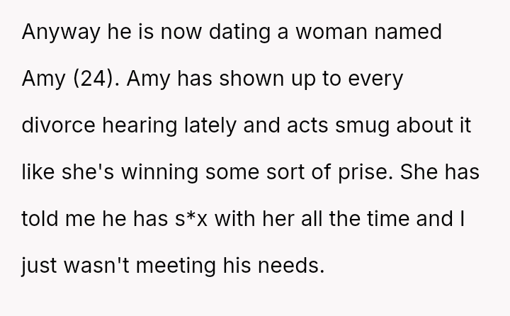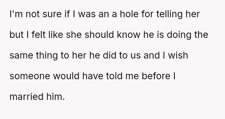 Her emotional conflict now centers on whether revealing her ex-husband's pattern of s*xual avoidance to his new partner was justified by a desire to inform, or if it const*tuted an inappropriate interference that caused unnecessary harm to the new relationship.