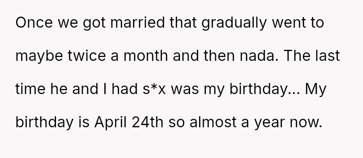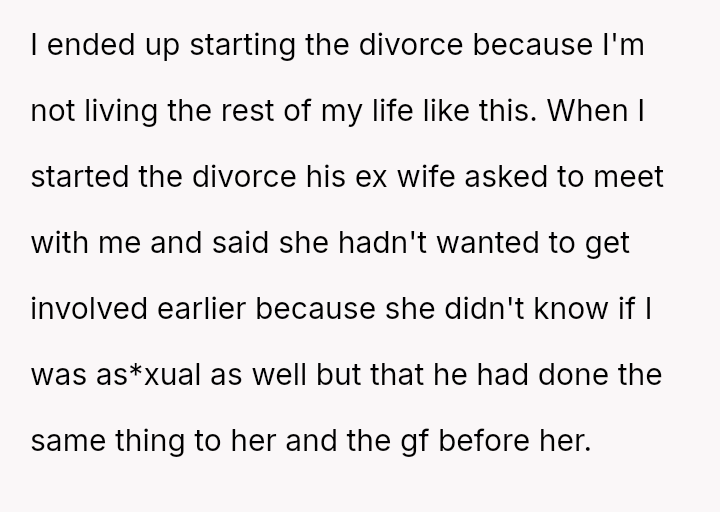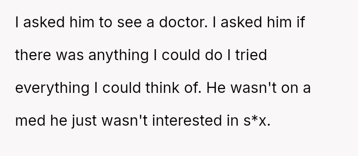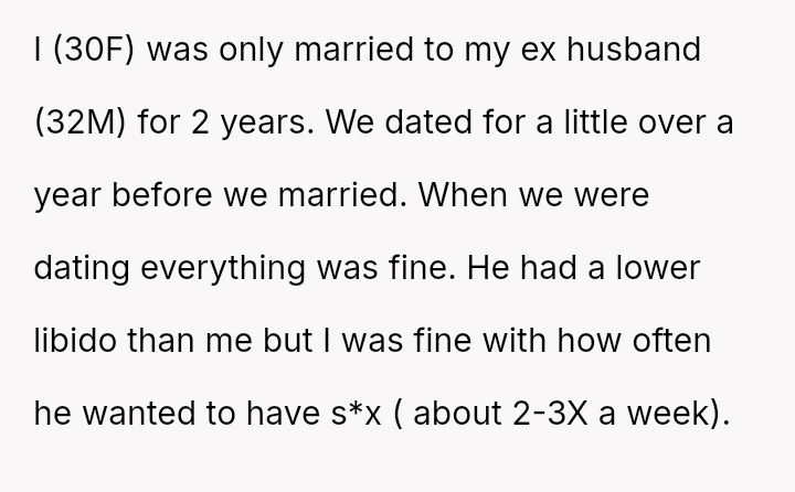 The original poster (OP) initiated divorce proceedings due to a persistent and significant lack of s*xual intimacy in her marriage, an issue she attempted to resolve through communication and suggestion.