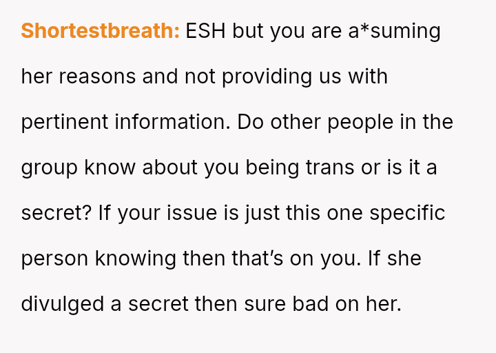 Is the OP overreacting to their best friend outing their transgender status to a new partner to secure the relationship, or was the friend justified in prioritizing her new relationship's perceived security over her long-time friend's right to privacy and autonomy over their ident*ty disclosure?