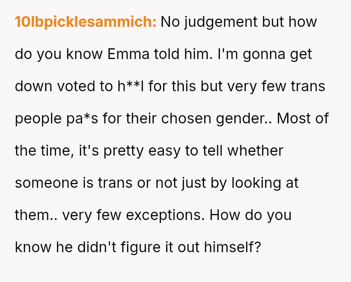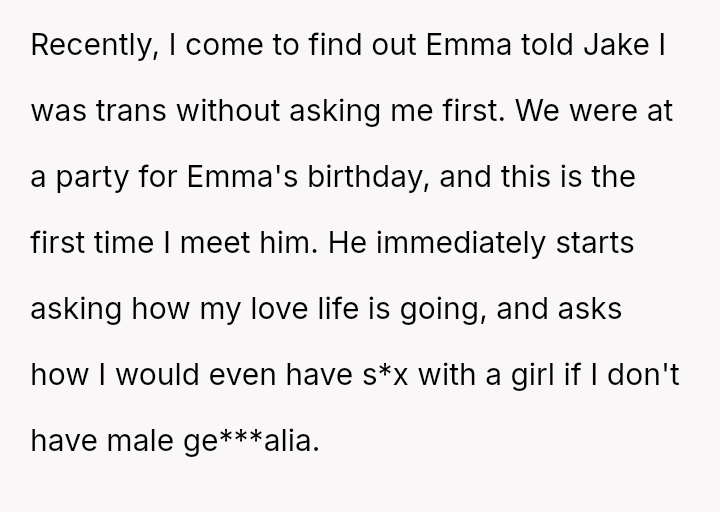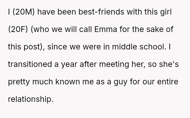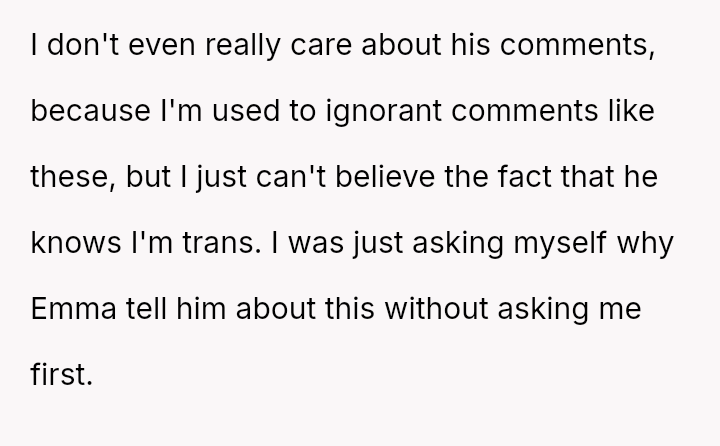 The original poster (OP) is deeply hurt and feels betrayed because their best friend, Emma, disclosed their transgender status to her new boyfriend without obtaining prior consent.