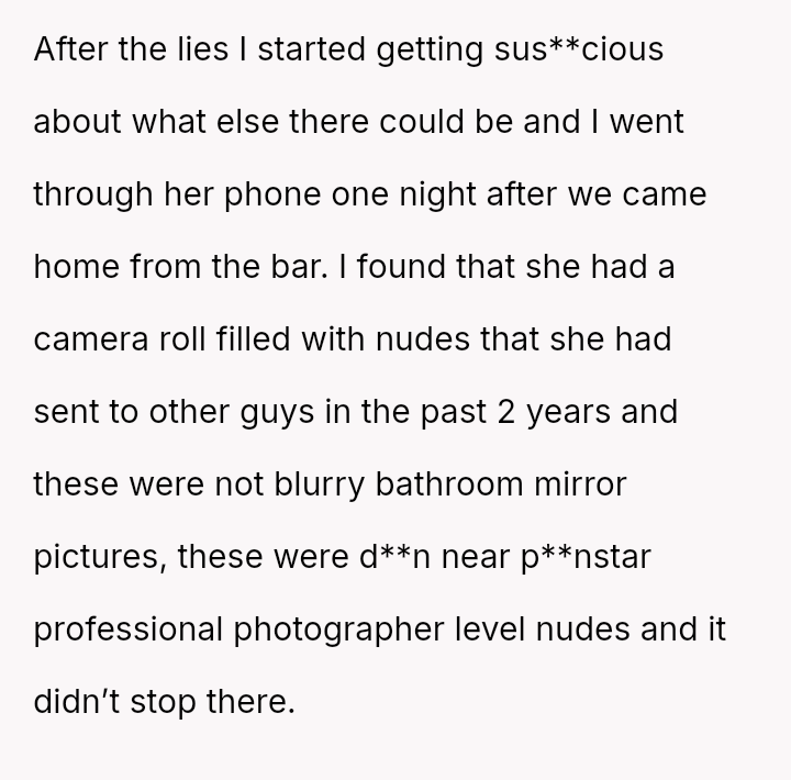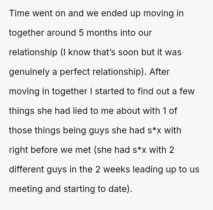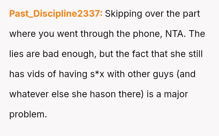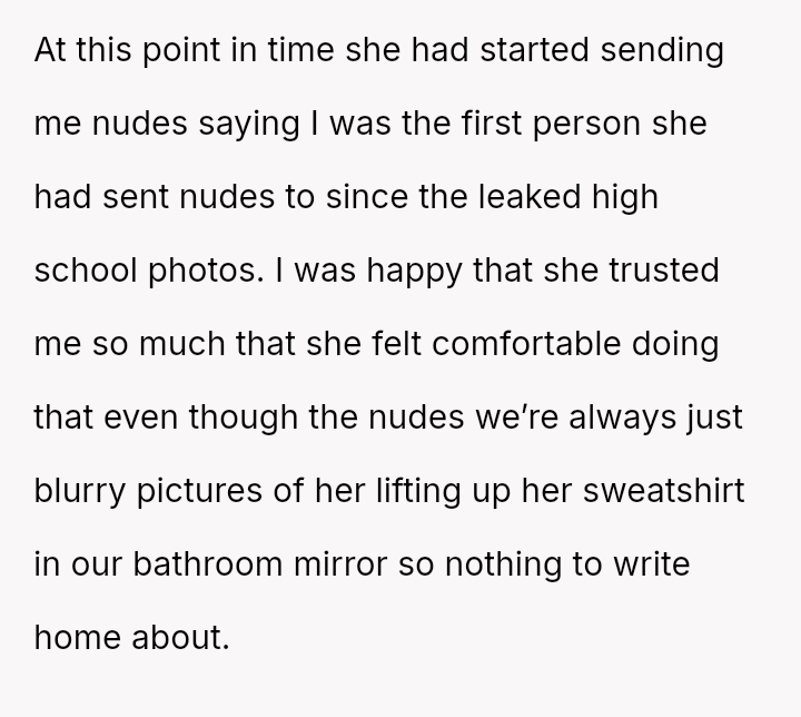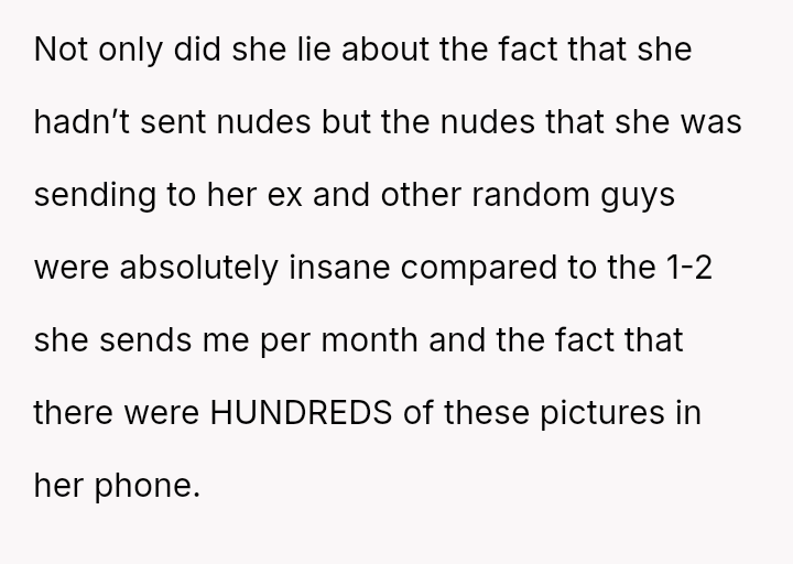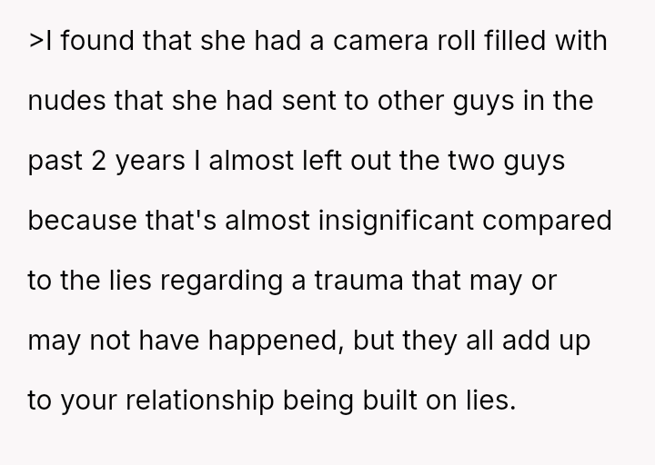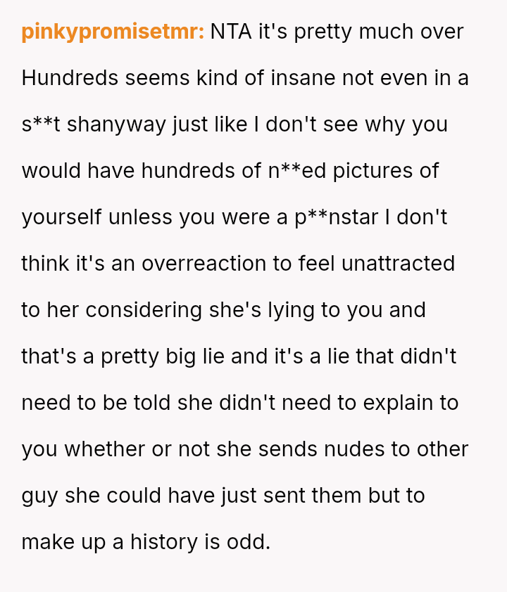 Considering the girlfriend's trauma-based explanation for her initial refusal to send intimate media versus the reality of her extensive past behavior and lies, is the OP's resulting loss of s*xual attraction and desire to end the relationship a justified response to deception, or is it an overreaction to information that is technically historical?