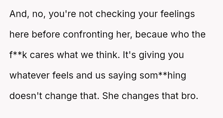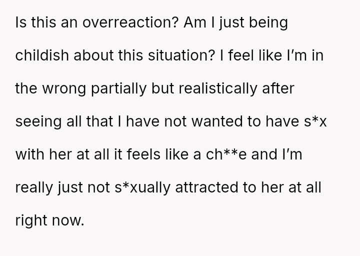 This betrayal of trust has caused the OP to lose s*xual desire for her, viewing intimacy as a ch**e.