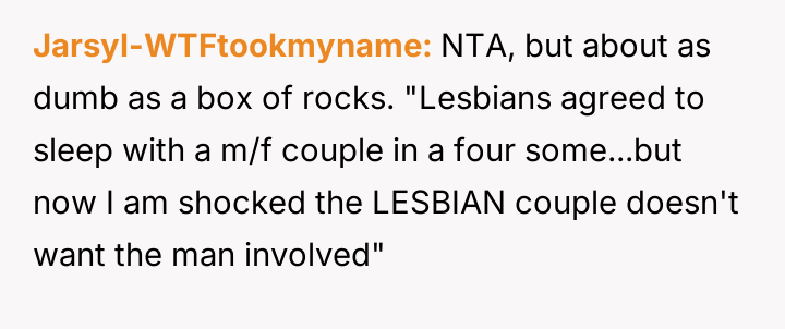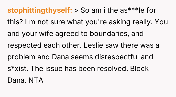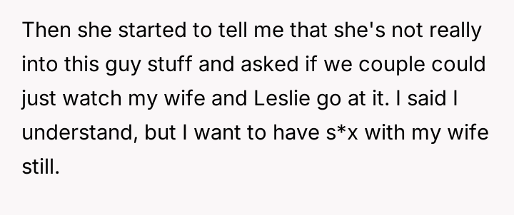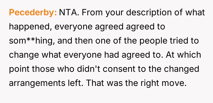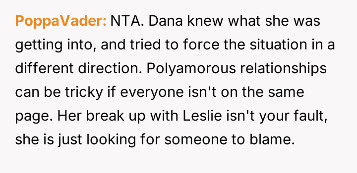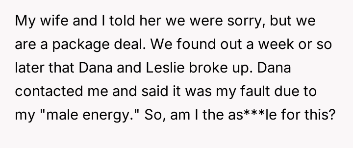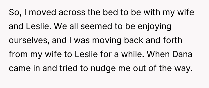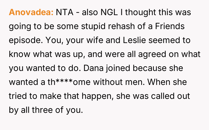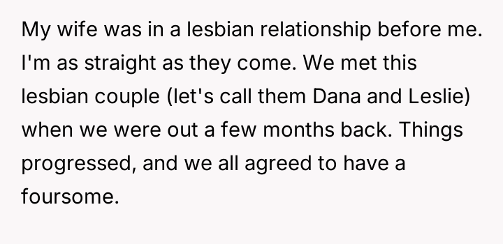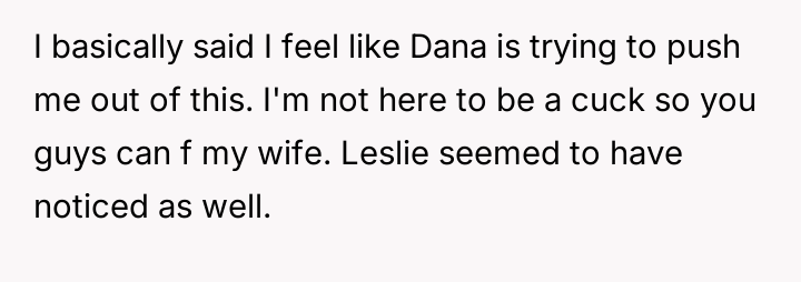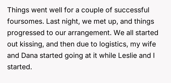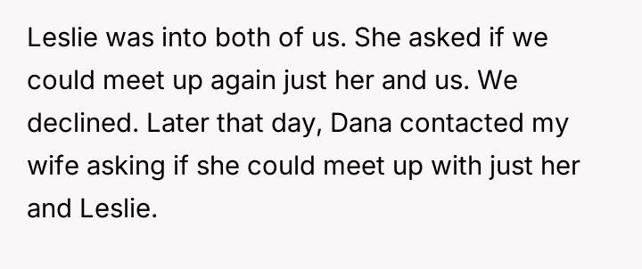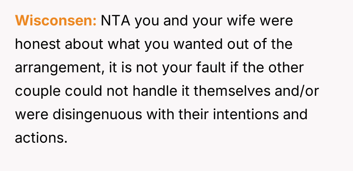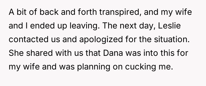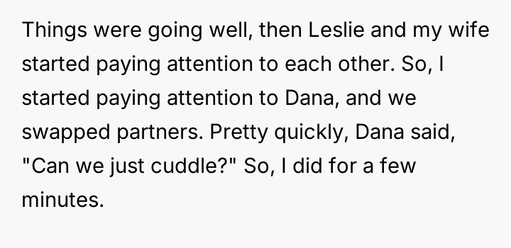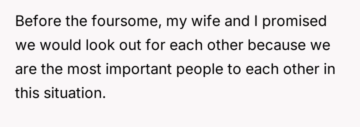 The central conflict arose when one partner in the other couple, Dana, acted outside of these agreed-upon boundaries, attempting to isolate the OP and engineer a situation where only his wife was involved with the other individuals, which the OP correctly identified as undermining their initial agreement.