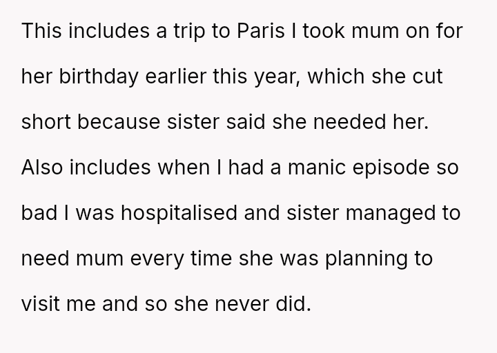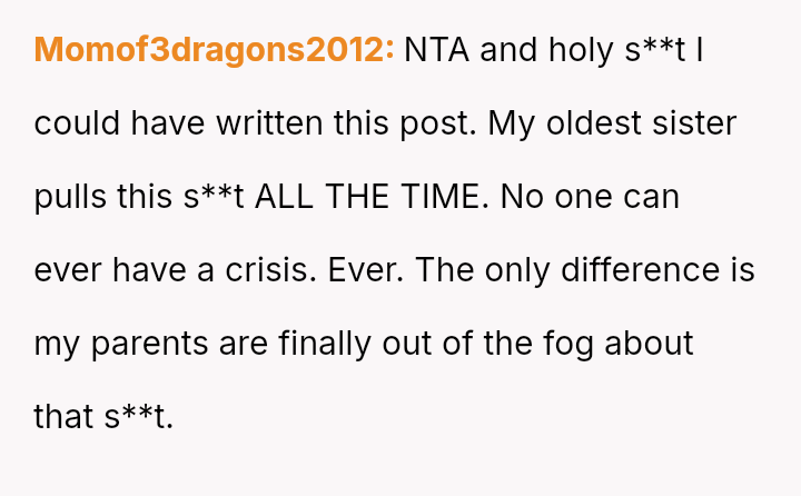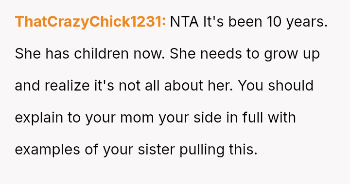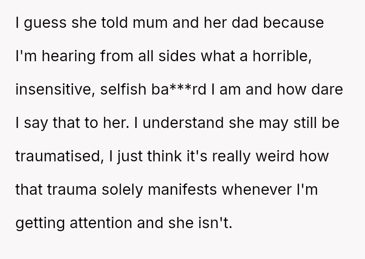 Given the sister's consistent pattern of weaponizing past trauma specifically when attention shifts away from her, is the OP justified in calling out this manipulative behavior, or does the potential for genuine, latent trauma mandate silence and compliance?