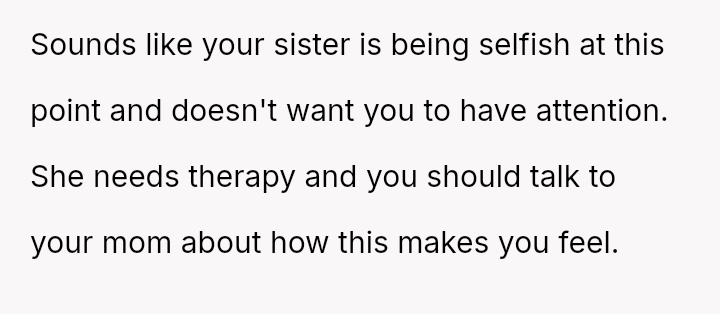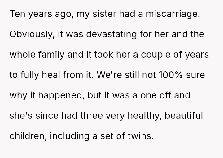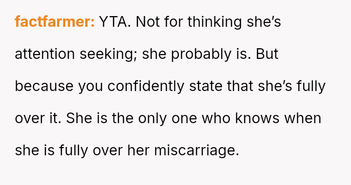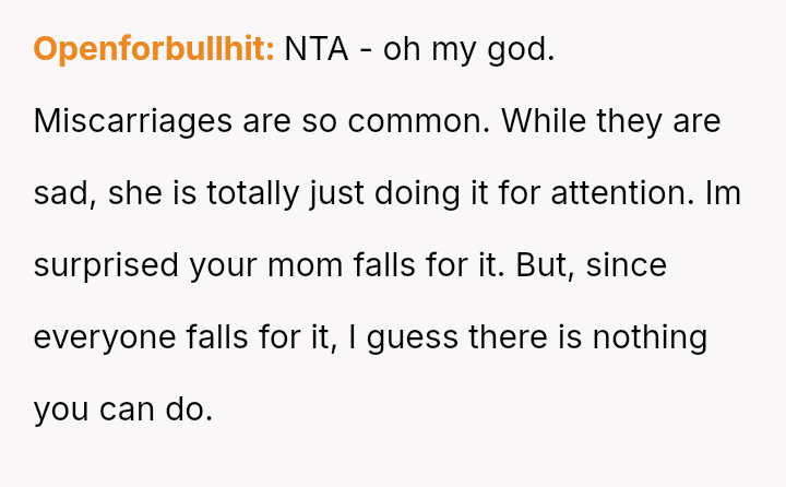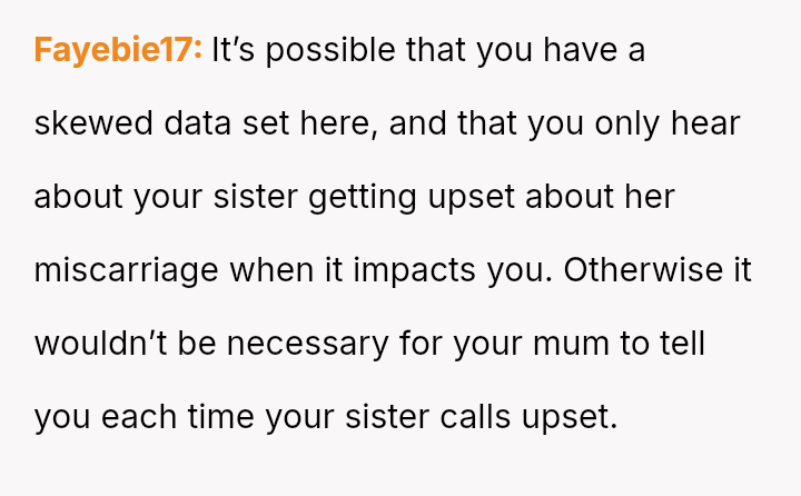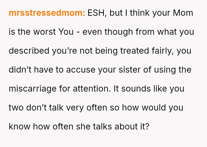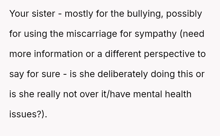 The original poster (OP) is facing severe backlash for confronting their older sister about using a past family tragedy—a miscarriage ten years ago—as a tool to gain parental attention whenever the OP receives positive focus.