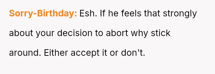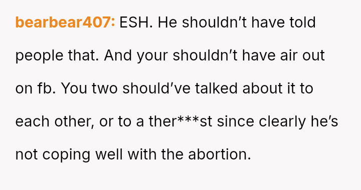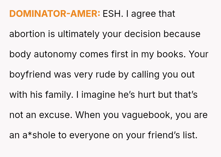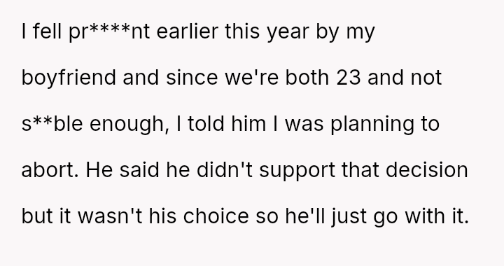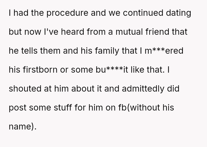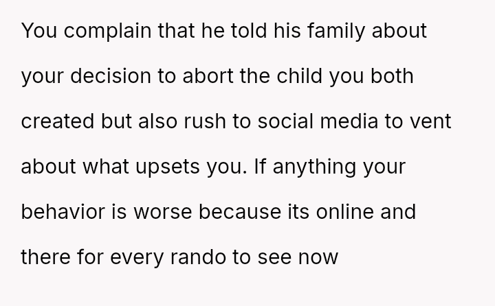The original poster is facing emotional fallout after making a personal decision regarding pregnancy termination, a choice her boyfriend initially accepted but now appears to be publicly criticizing through inflammatory language shared with friends and family.