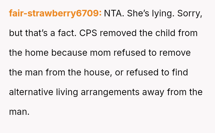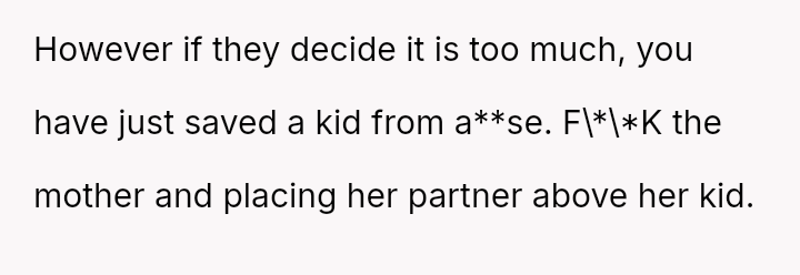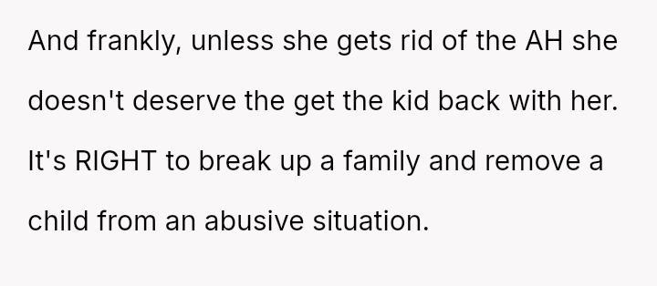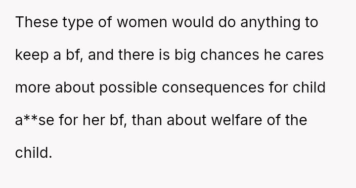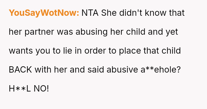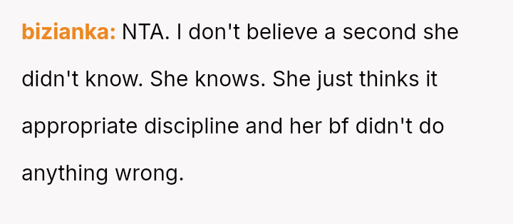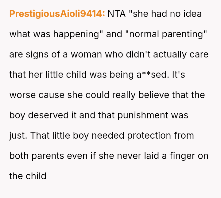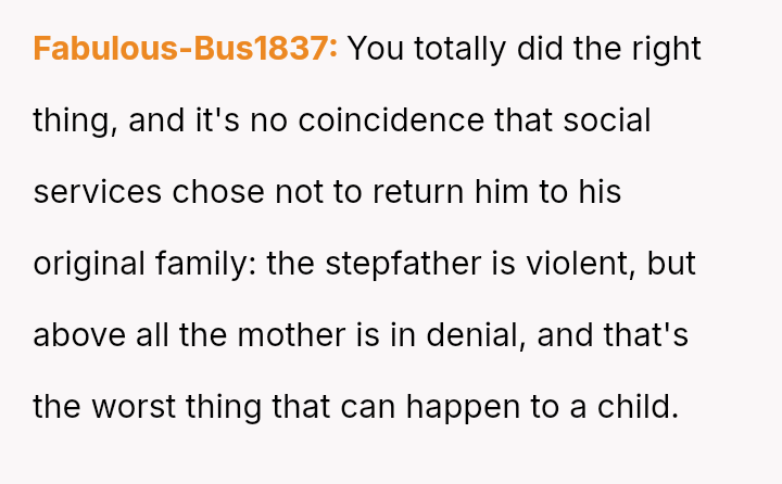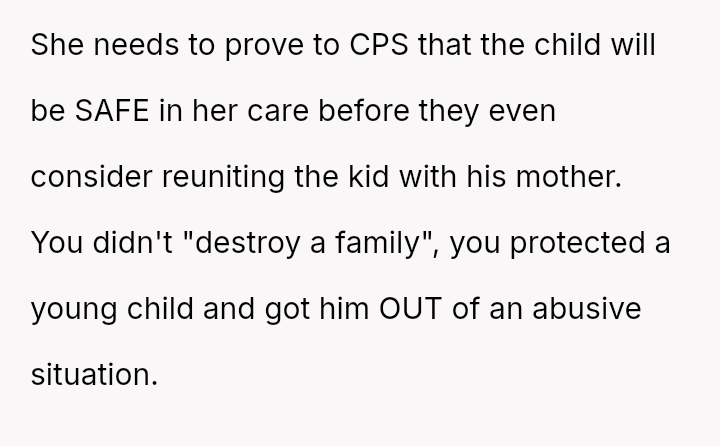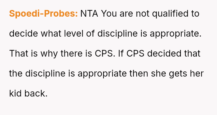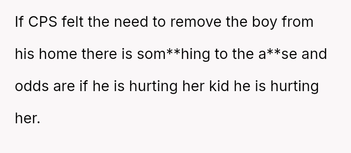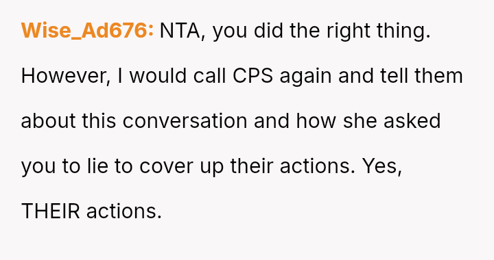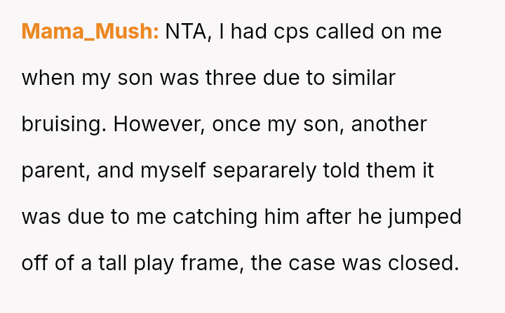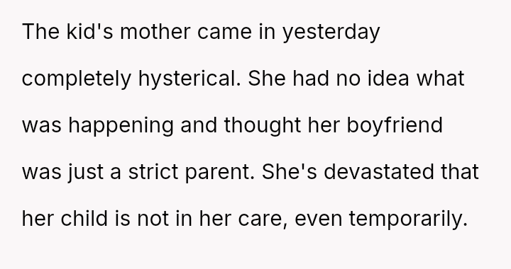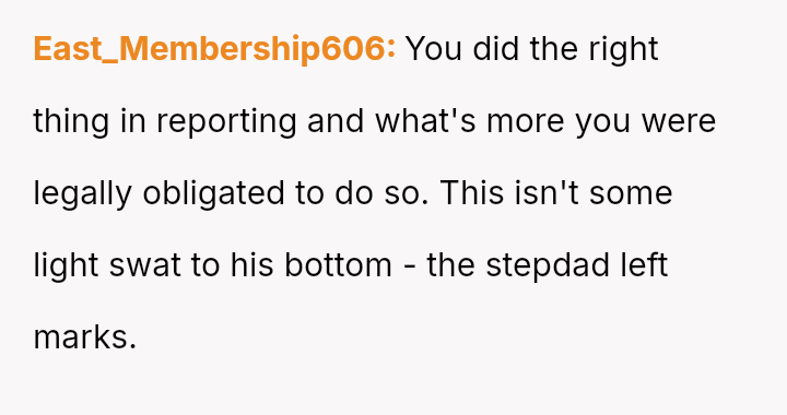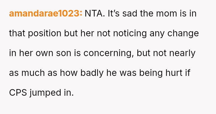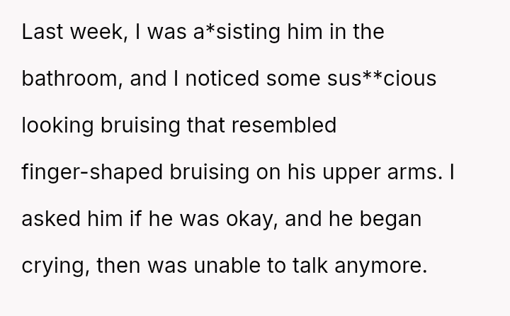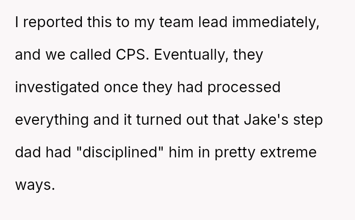 When the narrator noticed bruising resembling finger marks on the child's arms and the child became too distressed to speak, the situation escalated, leading to a report to Child Protective Services (CPS) and the child being placed temporarily with his grandmother after allegations of extreme 'discipline' by the step-dad.