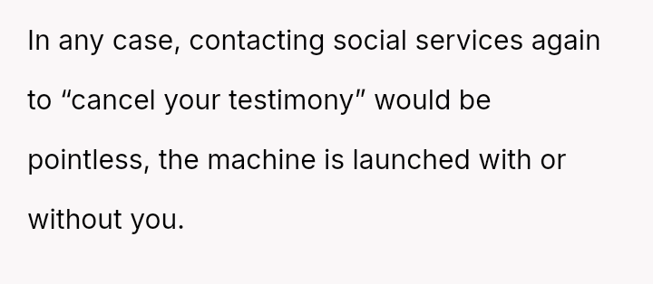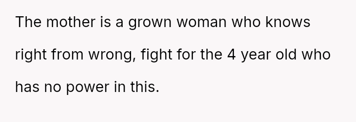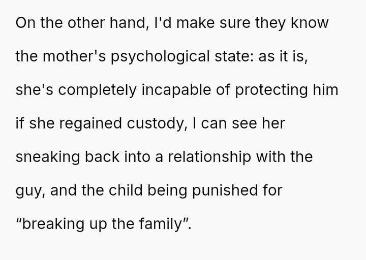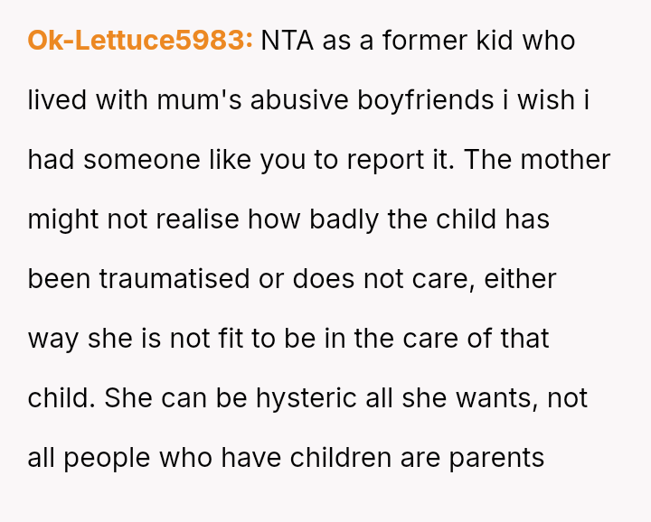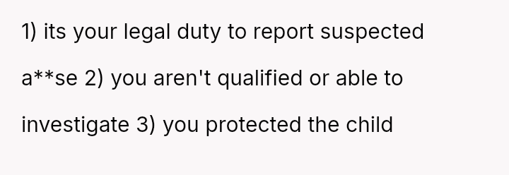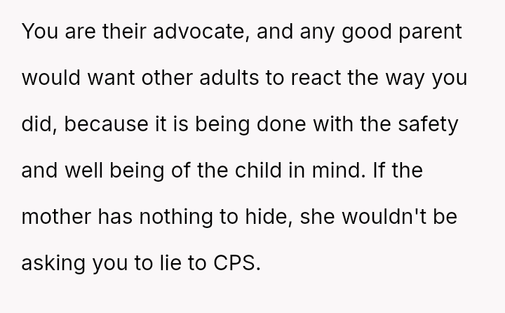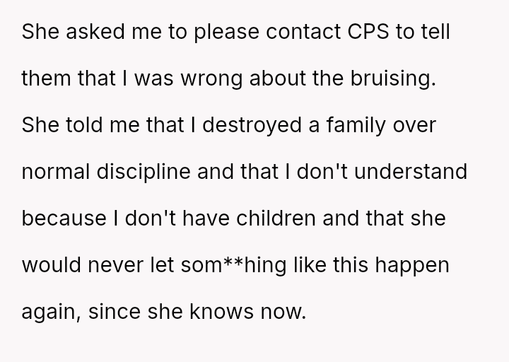 Despite acknowledging the mother's pain, the narrator remains confident that reporting the sus**cious bruising was the correct action for the child's safety.