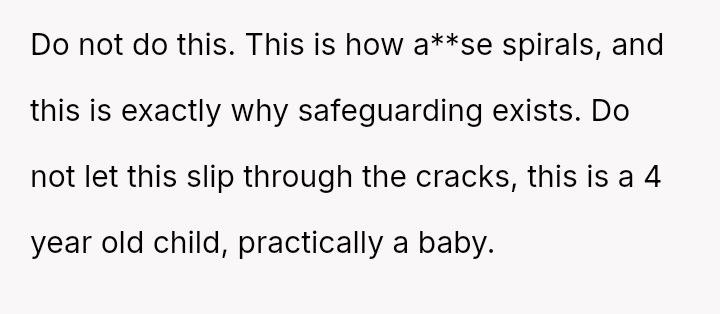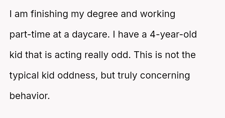 The narrator, who is finishing a degree and working part-time at a daycare, noticed a four-year-old child exhibiting extremely concerning behavior.