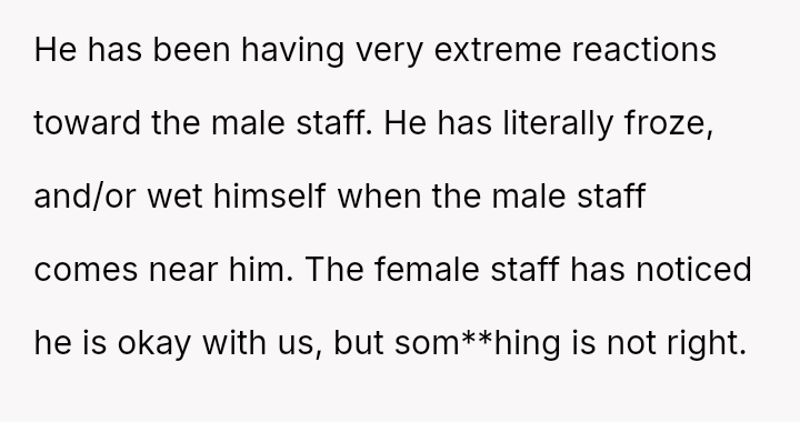The child reacted with extreme distress, including freezing or wetting himself, specifically around male staff members, though he was fine with the female staff.