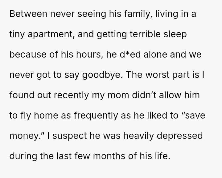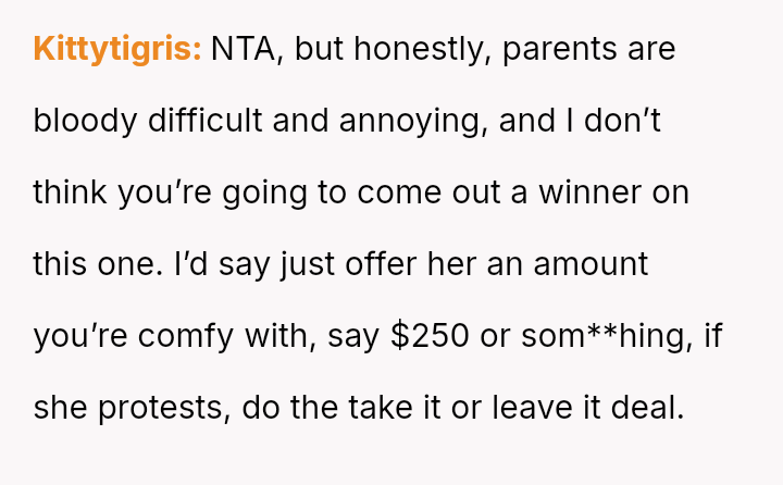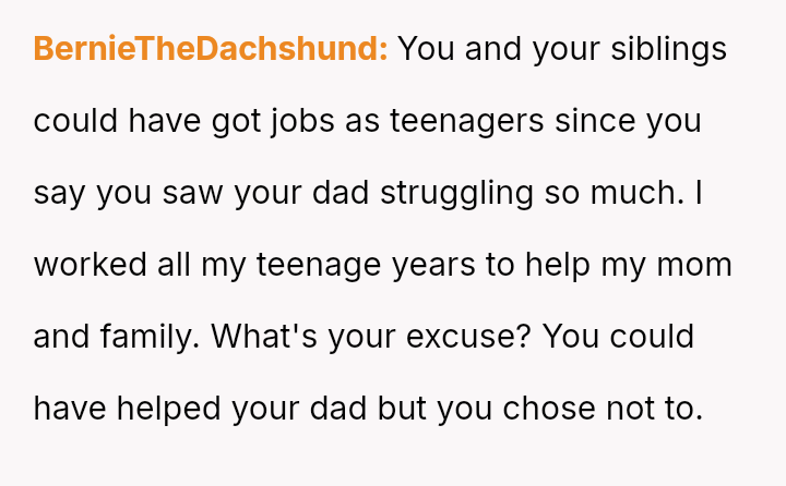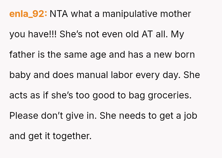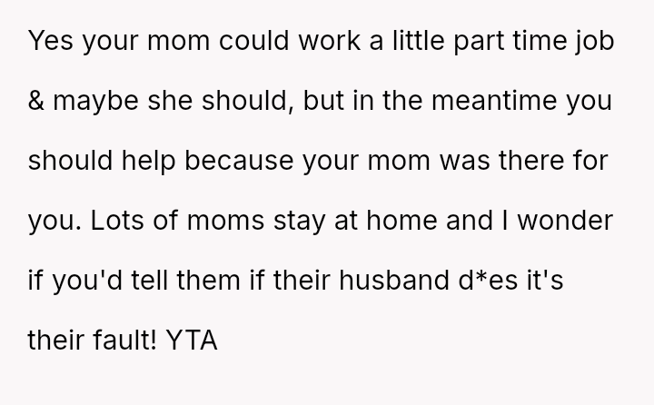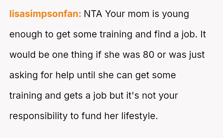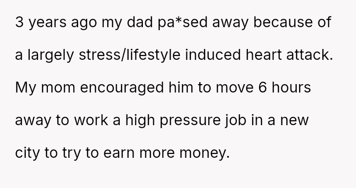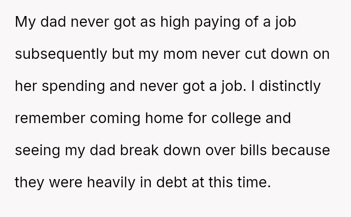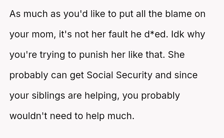 Given the deep-seated history of financial strain and the tragic outcome of the father's stress, is the OP justified in refusing financial aid to set a firm boundary regarding their mother's choices, or does the duty to support an aging parent outweigh the need for accountability for past behaviors?