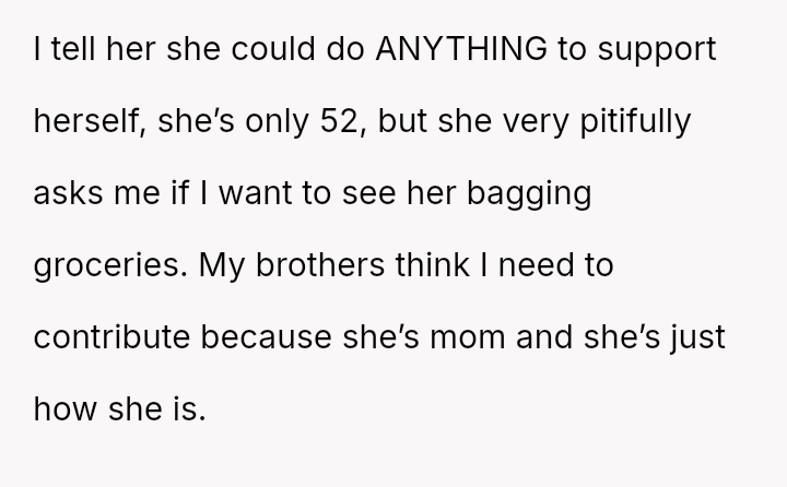 The central conflict lies between the OP's principled stand on financial autonomy and responsibility versus the filial expectation held by their brothers and potentially society that they must provide for their mother regardless of past grievances.